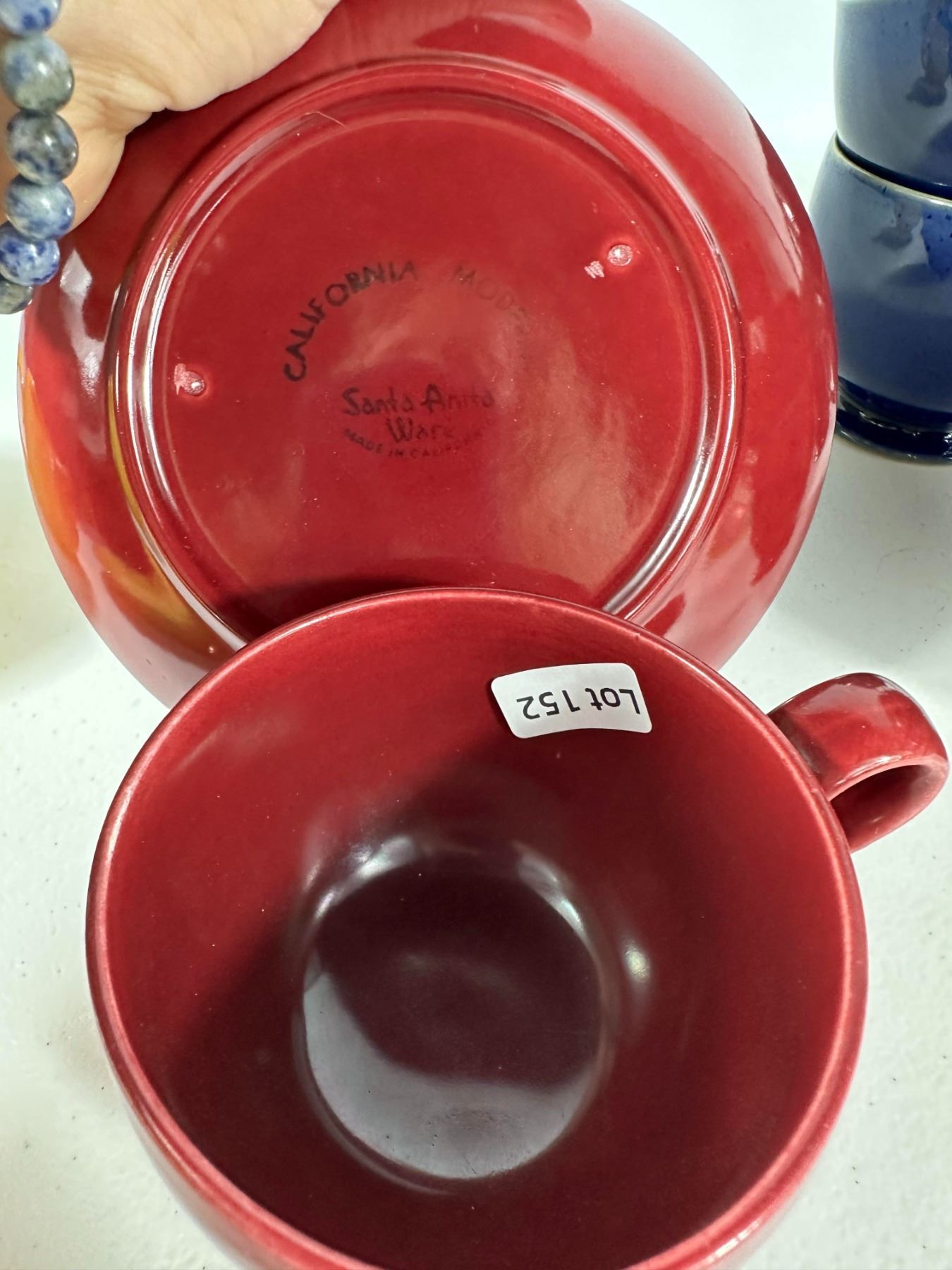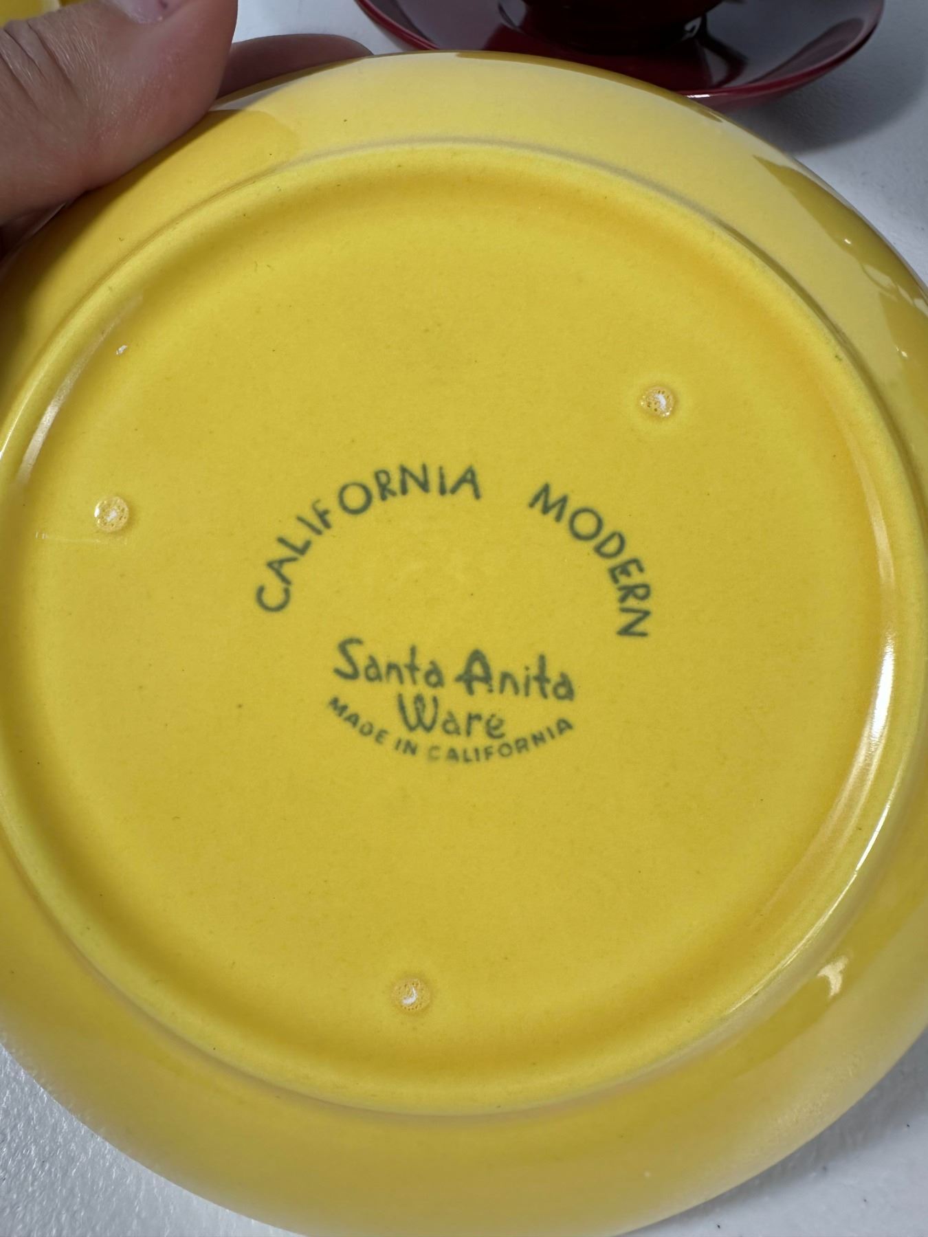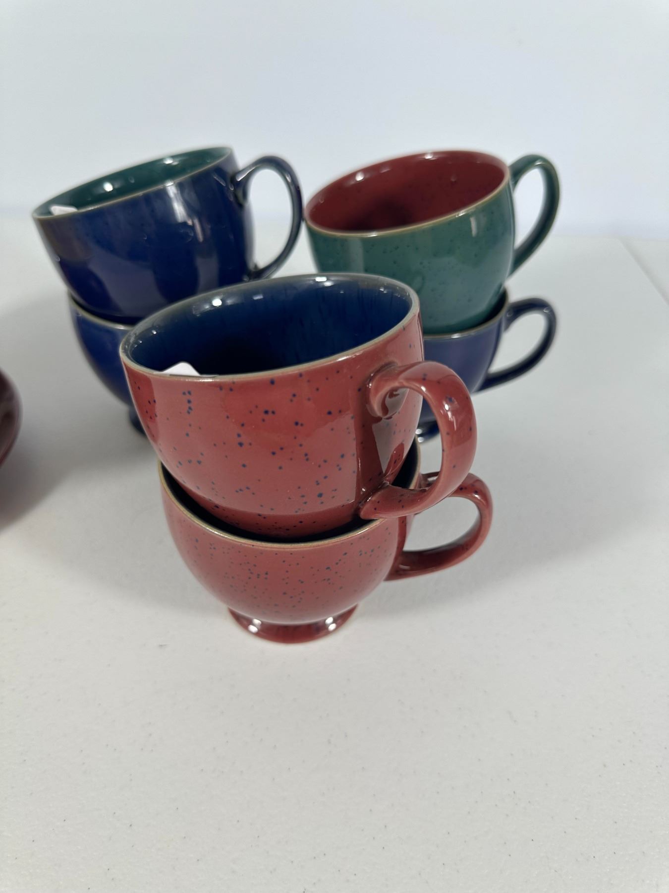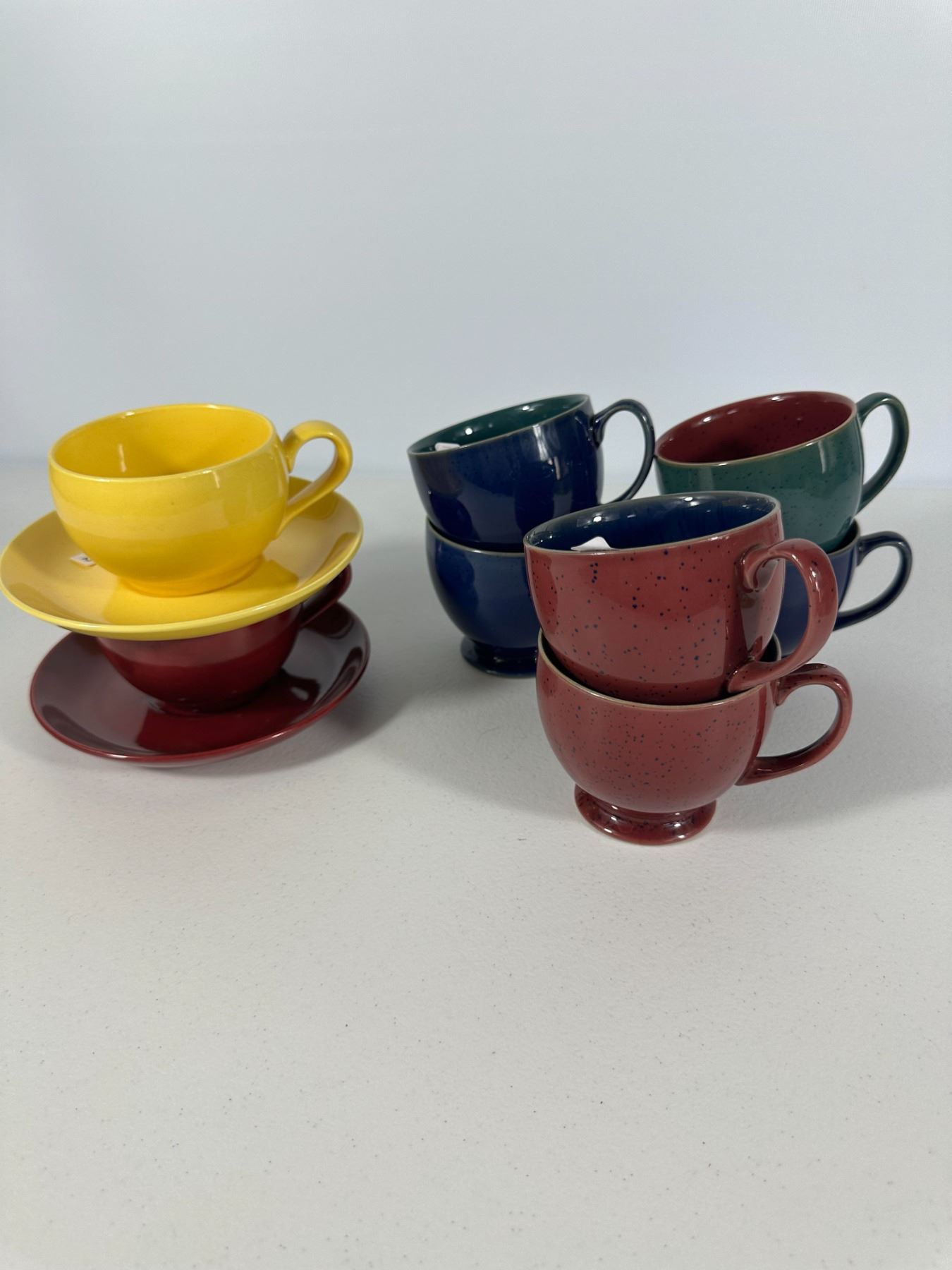 Includes a set of Santa Anita Ware 'California Modern' yellow teacup and saucer along with Denby England 'Classic' speckled mugs in red, blue, and green. Stylish mid-century and English stoneware pieces.