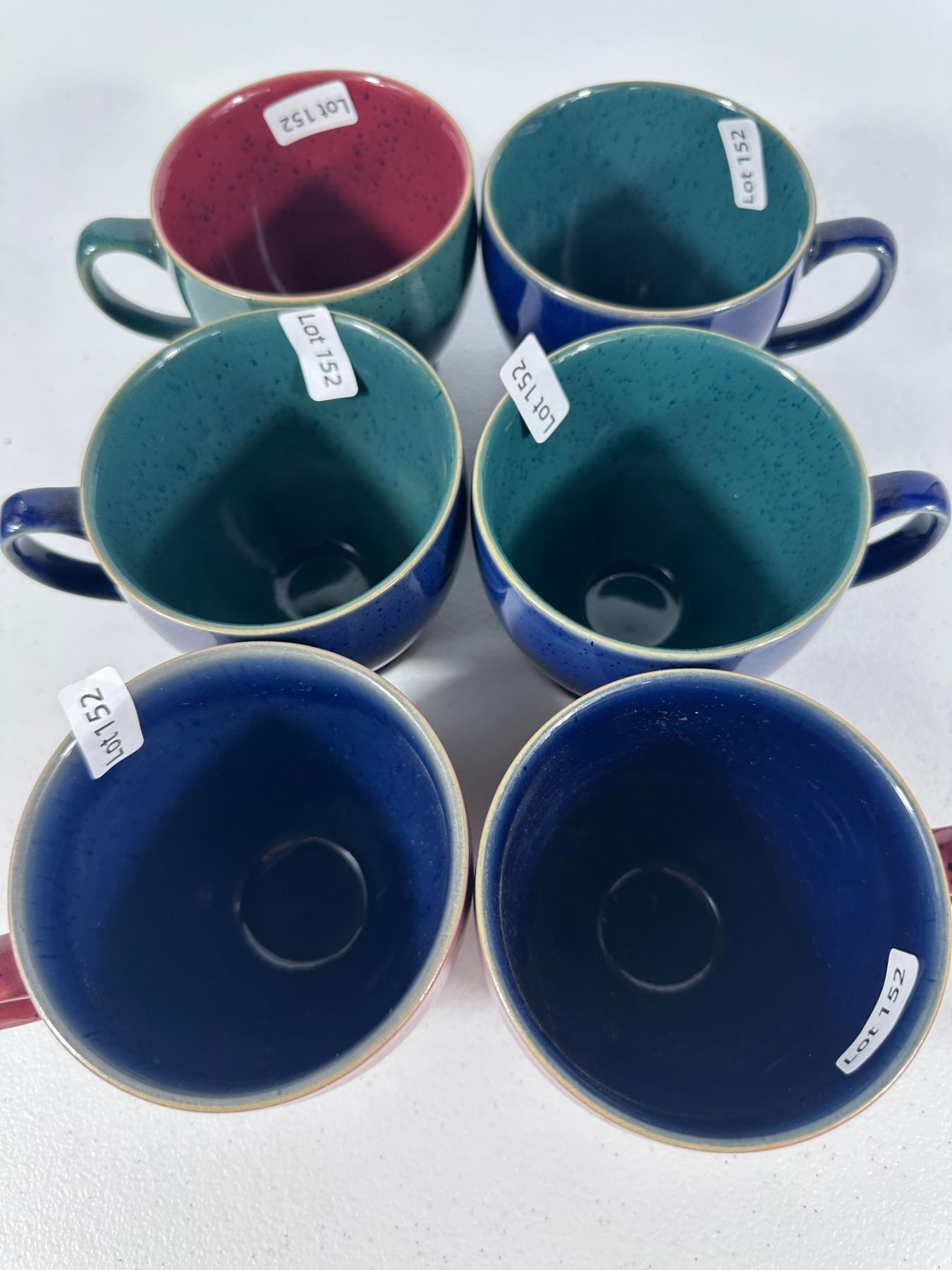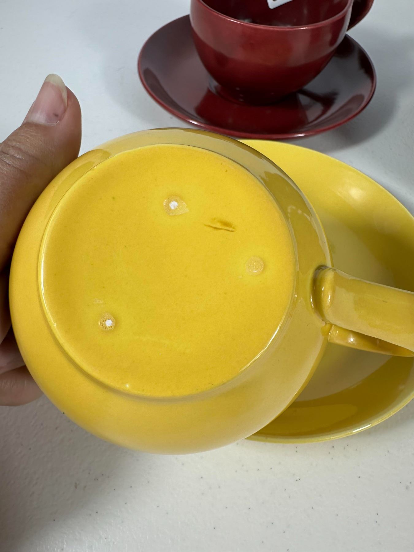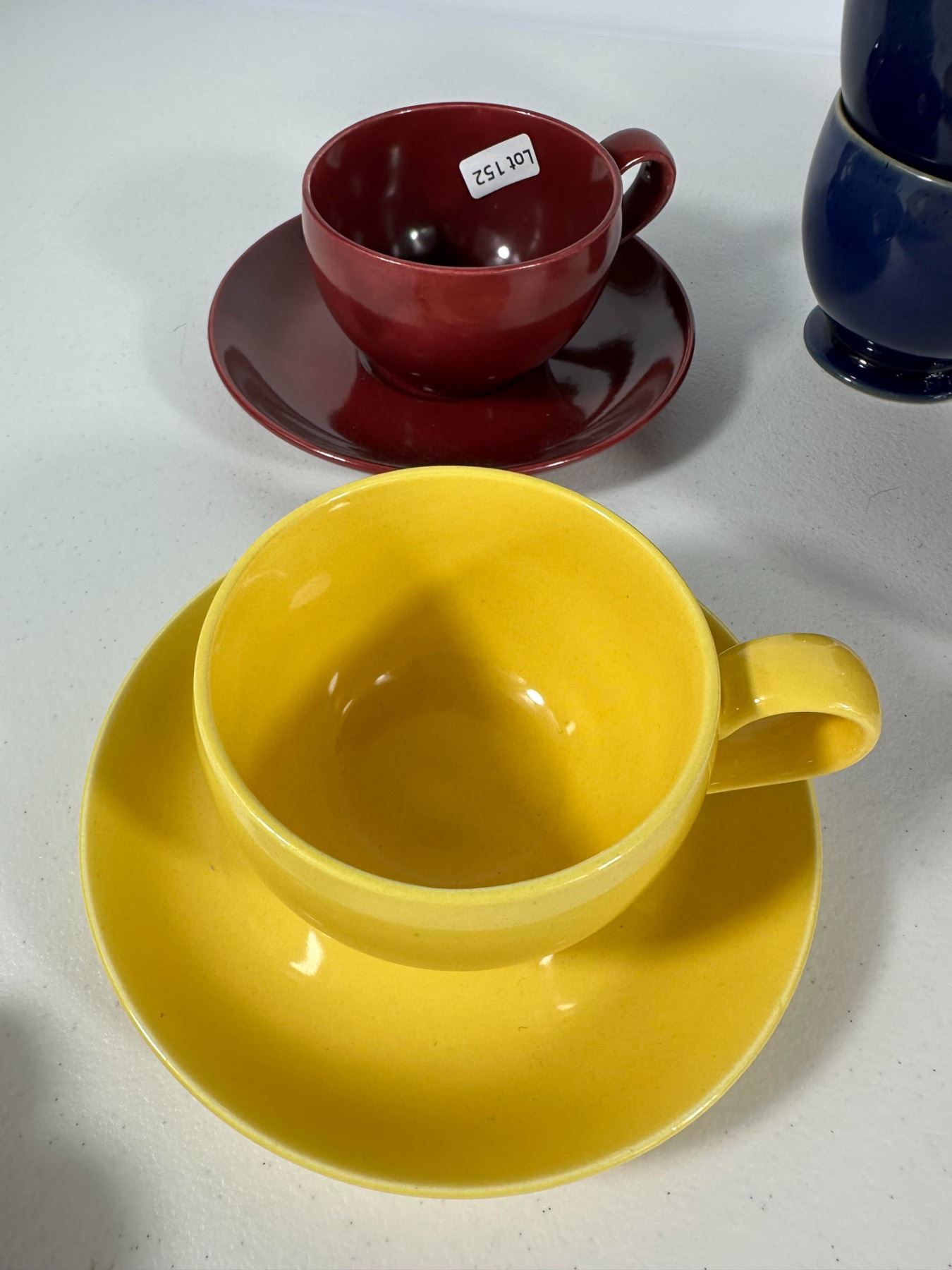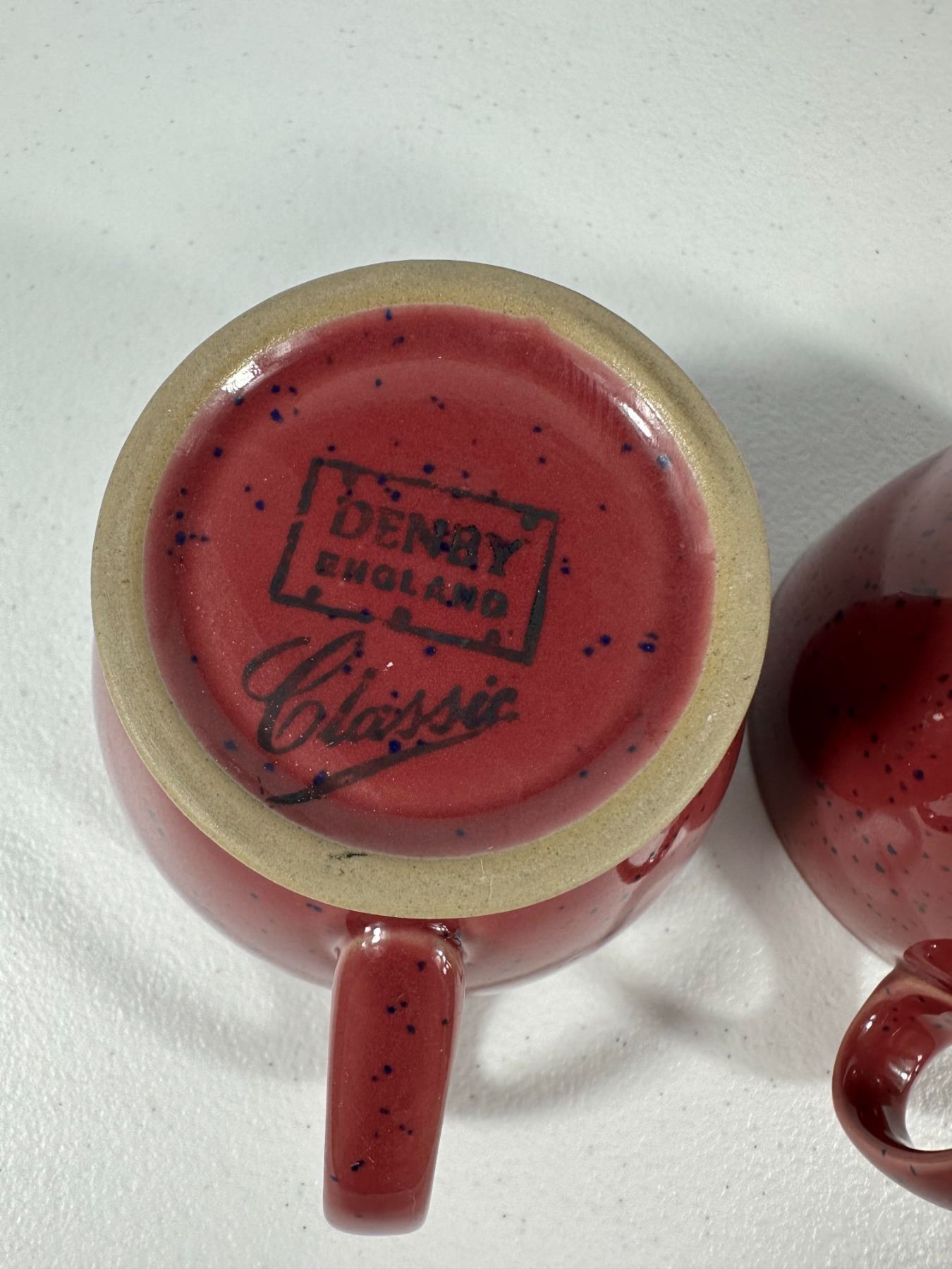 Includes a set of Santa Anita Ware 'California Modern' yellow teacup and saucer along with Denby England 'Classic' speckled mugs in red, blue, and green. Stylish mid-century and English stoneware pieces.