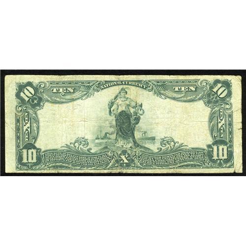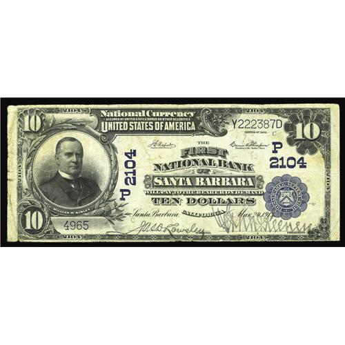 <B>Santa Barbara, CA</B></I> - $10 1902 Plain Back Fr. 629 <B>First National Bank</B></I> Ch. # (P)2104<BR>There is only one $10 1902 Plain Back in the census for this bank and it is not this note. Also, only twelve banks in California issued notes with the Treasury signature combination of Napier-Thompson. This <B>Fine</B></I> note has darkly printed signatures and a couple of left-hand margin tears.