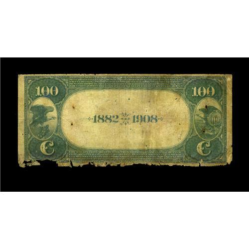 <B>Santa Barbara, CA</B></I> - $100 1882 Date Back Fr. 571 <B>Santa Barbara County National Bank, Santa Barbara</B></I> Ch. # (P)2456<BR>This is the first 1882 $100 Date Back to be recorded for the bank, and one that has seen better days, to say the least. The note has been spindled multiple times, and along with the bottom edge, keeps this on the low end of the grading scale. This also makes only the eighth 1882 $100 Date Back recorded for the state of California, and 124 for the entire country. Type Collectors take notice. When will you have this chance again? <B>Good.</B></I>