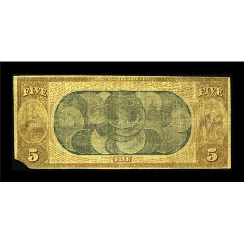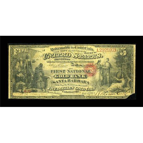 <B>Santa Barbara, CA</B></I> - $5 Original National Gold Bank Note Fr. 1139 <B>The First National Gold Bank</B></I> Ch. # 2104<BR> This is one of the scarcest of the national Gold Banks, with the census now reporting only ten $5 examples in all grades combined. This piece has long been part of that census. There are a few pinholes and tiny internal splits, and the bottom right corner is missing, but the overall appearance is still more than acceptable, with the note itself grading <B>Very Good. </B></I>The two finest examples grade only Very Good or so, with half the census listed as Good or below. <BR><I>From The Thomas M. Flynn Collection</B></I><BR><BR><b>Shipping:</b> Coins & Currency (<a target="_blank" href="http://www.heritageauctions.com/common/shipping.php">view shipping information</a>)