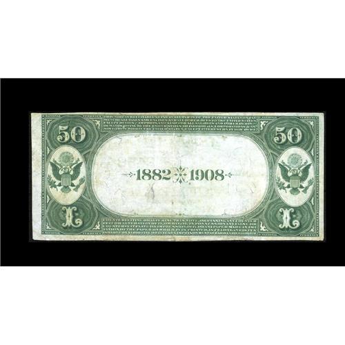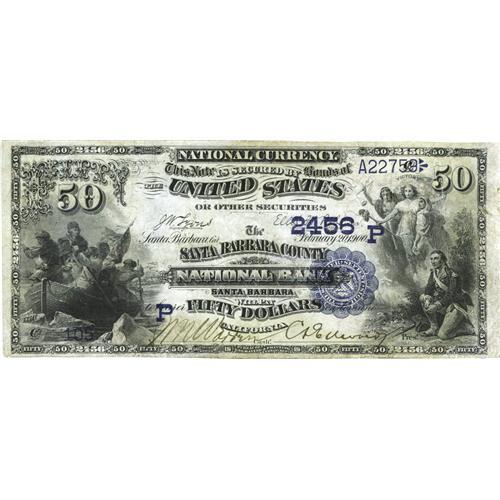 <B>Santa Barbara, CA</B></I> - $50 1882 Date Back Fr. 563 <B>The Santa Barbara County NB</B></I> Ch. # (P)2456<BR>Ex-Krakover and ex-Colver, this note is ready to join another fabled collection. Before entering the numismatic community, this note resided in the walls of a house southwest of San Antonio. It was discovered along with several other notes in the mid-1980s when the house was demolished. The pen signatures are sharp and clear. <B>Very Fine,</B></I> with traces of aging.