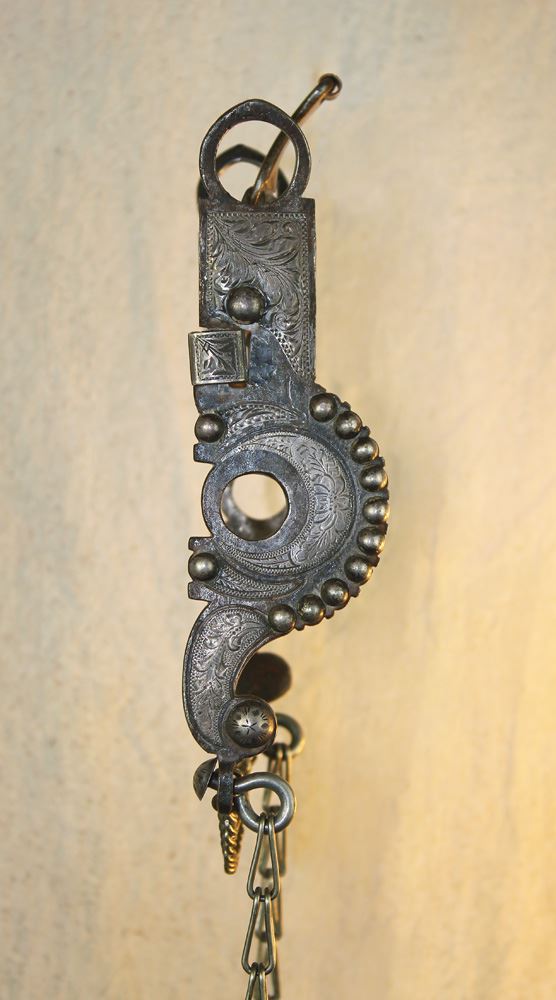Magnificently engraved silver inlaid California style spade bit, in beautiful condition, and with original rein chains.