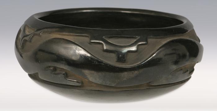 Santa Clara Blackware Bowl. 3 1/4" x 7 1/2". Decorated with the avanyu design. Made by Christina Naranjo (1891-1980). Signed Christina on bottom. Condition Report: Excellent condition. Shows minor scratches from age and use.