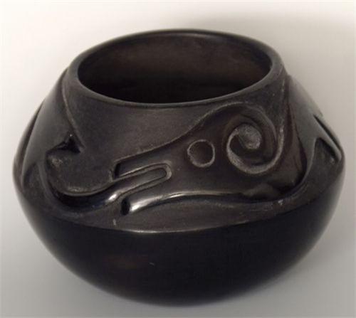 Santa Clara Bowl. 4 ½” x 5 ½”. Black on Black, AVANYA design. Fine condition. Signed Rose (Gonzales). Rose is credited as being the first potter to do the carved – style pottery. (est $500-750)