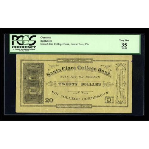 <B>Santa Clara, CA- Santa Clara College Bank</B></I> $20<BR> This elusive college scrip issue has been graded <B>PCGS Very Fine 35</B></I>. It would make a fine complement to the $5 also available.<BR><BR><b>Shipping:</b> Coins & Currency (<a target="_blank" href="http://www.heritageauctions.com/common/shipping.php">view shipping information</a>)