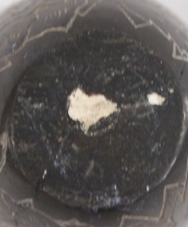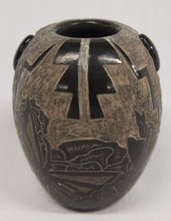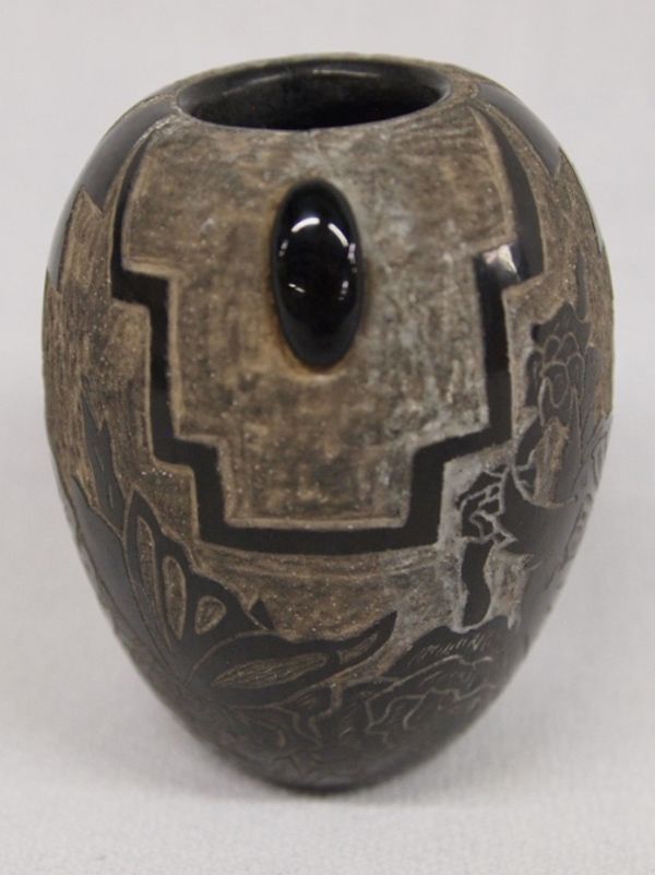 Santa Clara Carved Miniature Hummingbird and Butterfly Pot, measures 2.75''H x 2''W, has 2 onyx teardrop cab embellishments