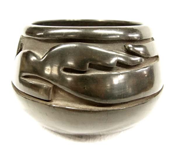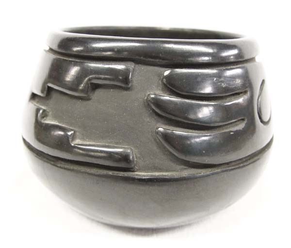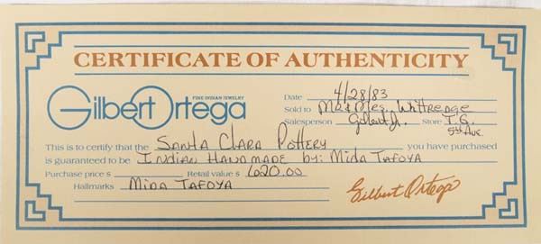 From the Whittredge Estate, we have a Native American Santa Clara Carved Pottery Jar by Mida Tafoya (1931-present), signed by artist and measures 4.5'' x 7''D, nice and heavy, thick walled, comes with COA from Gilbert Ortega's, FYI: ''Mida Tafoya is the granddaughter of Santa Clara Pottery Matriarch, Serafina (Sara Fina). Mida was born in 1931 and has been a potter for over 60 years. As of this writing, 2013, I believe she is still producing. Her work is very traditional.'' ''Since the age of 13, Mida has been making pottery.''