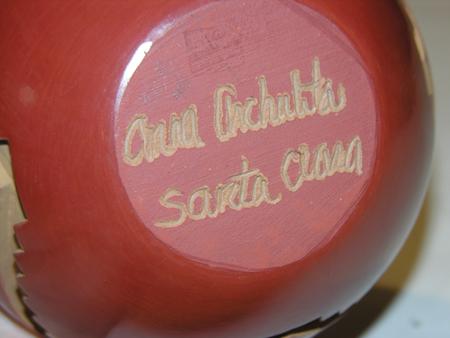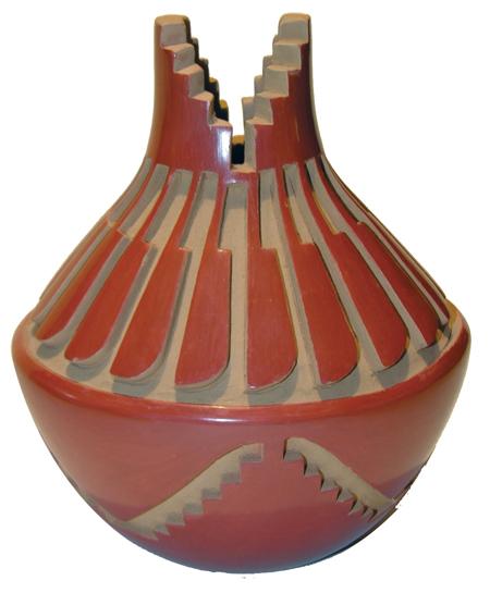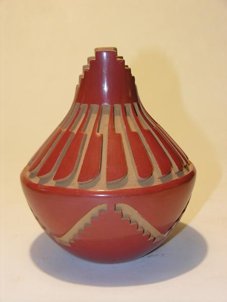 Circa Late 1900s, Exceptional Santa Clara carved redware jar on cream with cavrved stepped neck and design elements. Reference Page 5 in Schaaf Biography. 6-1/2" x 5-1/2"