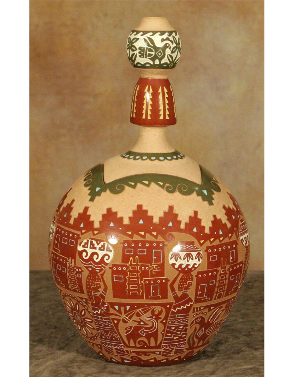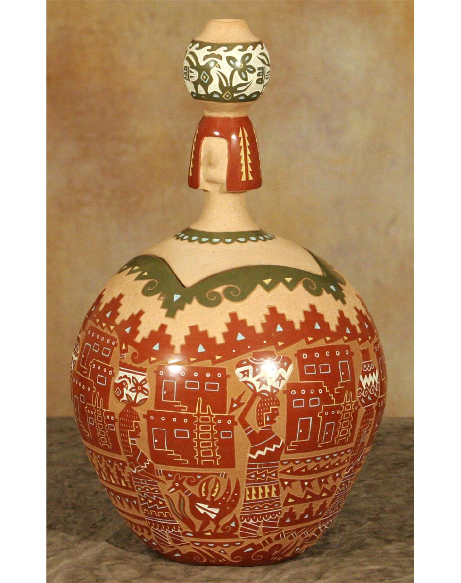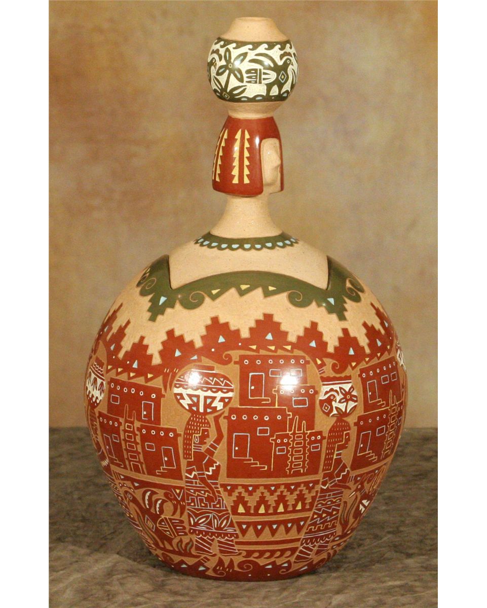 Santa Clara Lidded Jar by Emily Tafoya (1959 - ). 13.5" x 7.5". Sgraffito carved designs depicting water carriers and birds amongst an Adobe cityscape. Olla maiden figural lid. Some of the finest work found anywhere. Inscribed: [cypher] EMILY TAFOYA SCP. Provenance: Indian River Gallery.