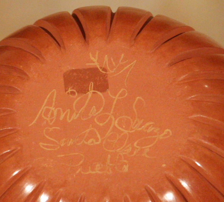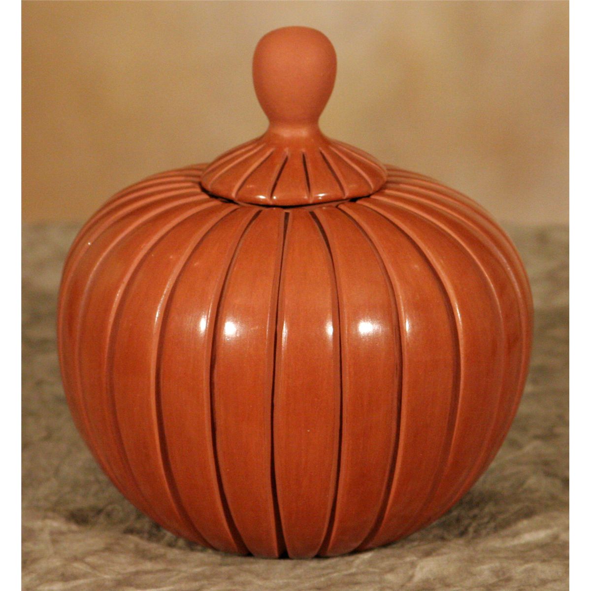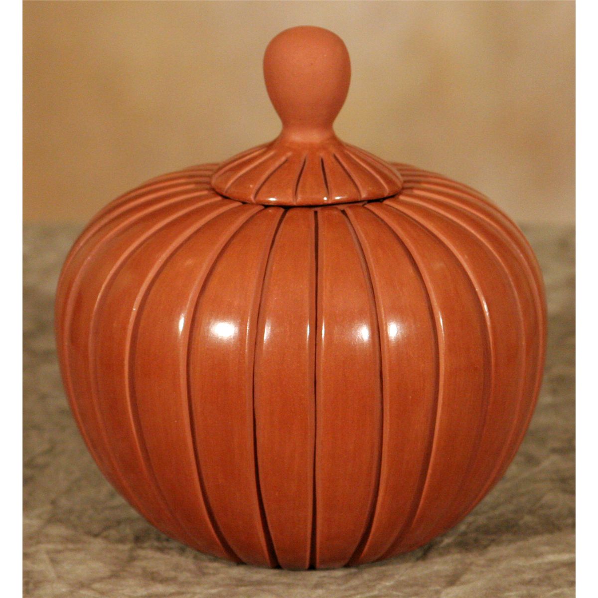 Santa Clara Melon Pot by Anita Suazo (1937 - ). 6.5" x 7.5". Redware pot with a lid. Inscribed: Anita Suazo, Santa Clara Pueblo with cypher.