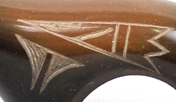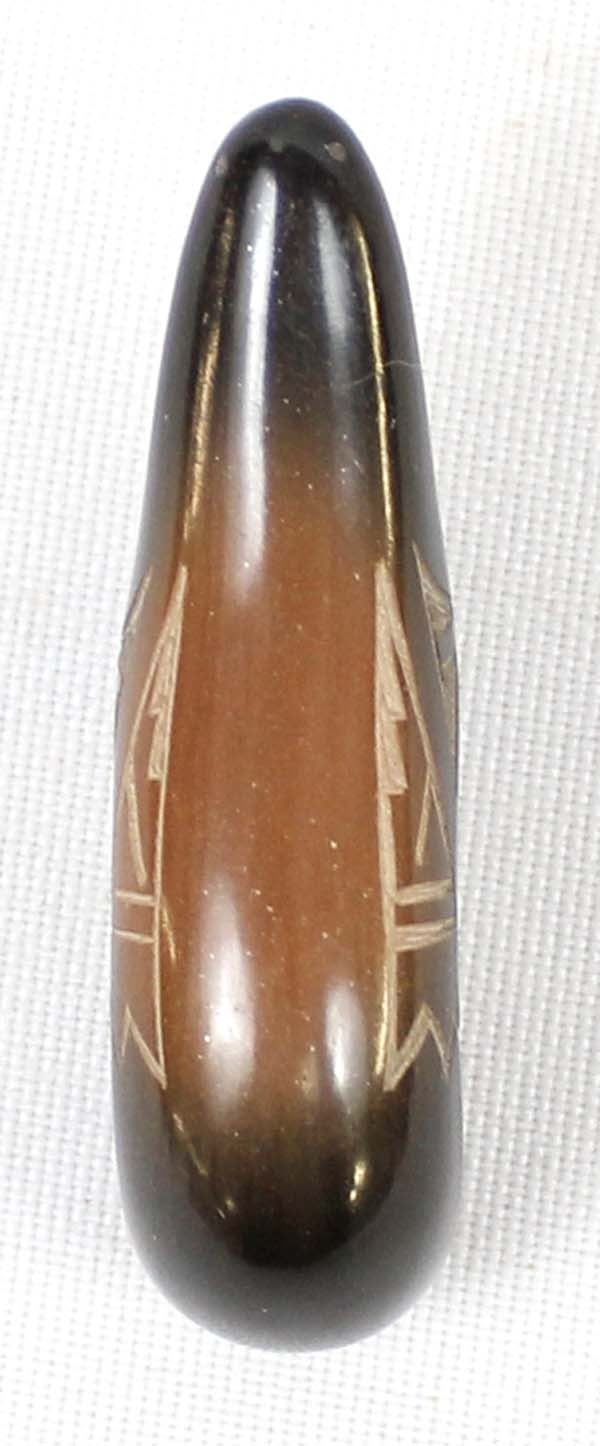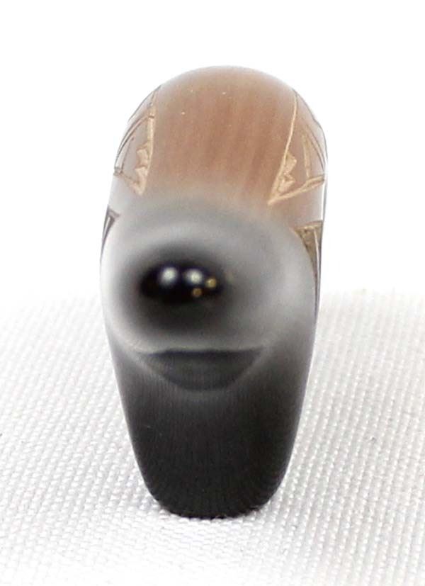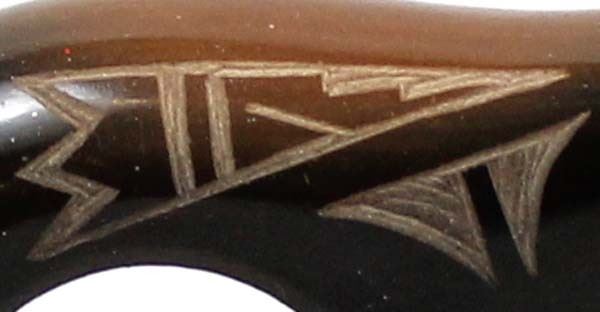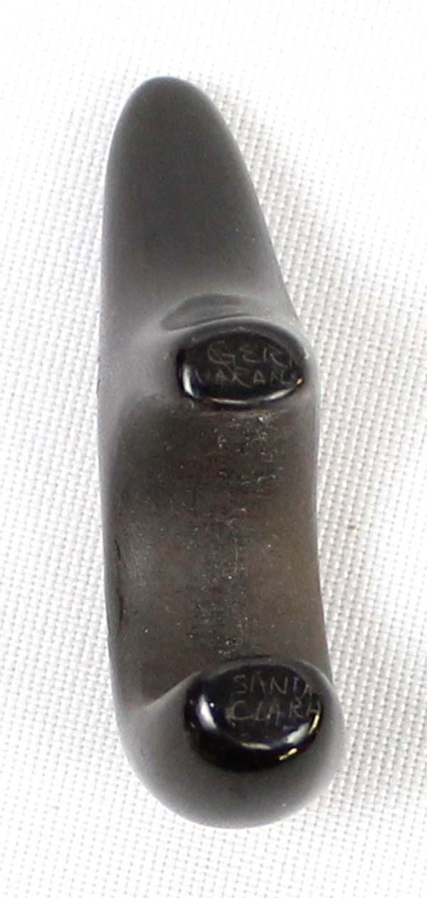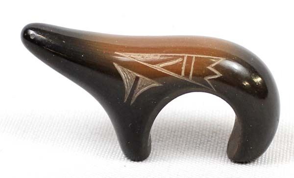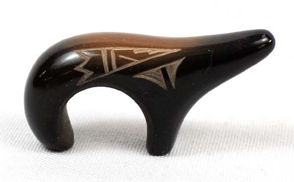 Native American Santa Clara Miniature Pottery Bear by Geri Naranjo, measures 2''L x 1.25''T and is signed on the bottom, sgraffito designs, FYI: ''Geri Naranjo is an extraordinary pottery who has been producing traditional pottery since 1975. She was born in 1952 and her mother, Ursalita Naranjo, began teaching her to work with clay in 1962. Geri began exhibiting in 1980 and won many awards between 1980 and 1998, including Best of Division three years in a row at Santa Fe Indian Market. She is best known for her miniature sgraffito-inscribed black pots. She, along with her daughter Monica and her son Kevin are the primary makers of miniature pottery at Santa Clara Pueblo. In 1998, Geri suffered a stroke and can no longer make her miniatures, however her daughter and son continue making them.''