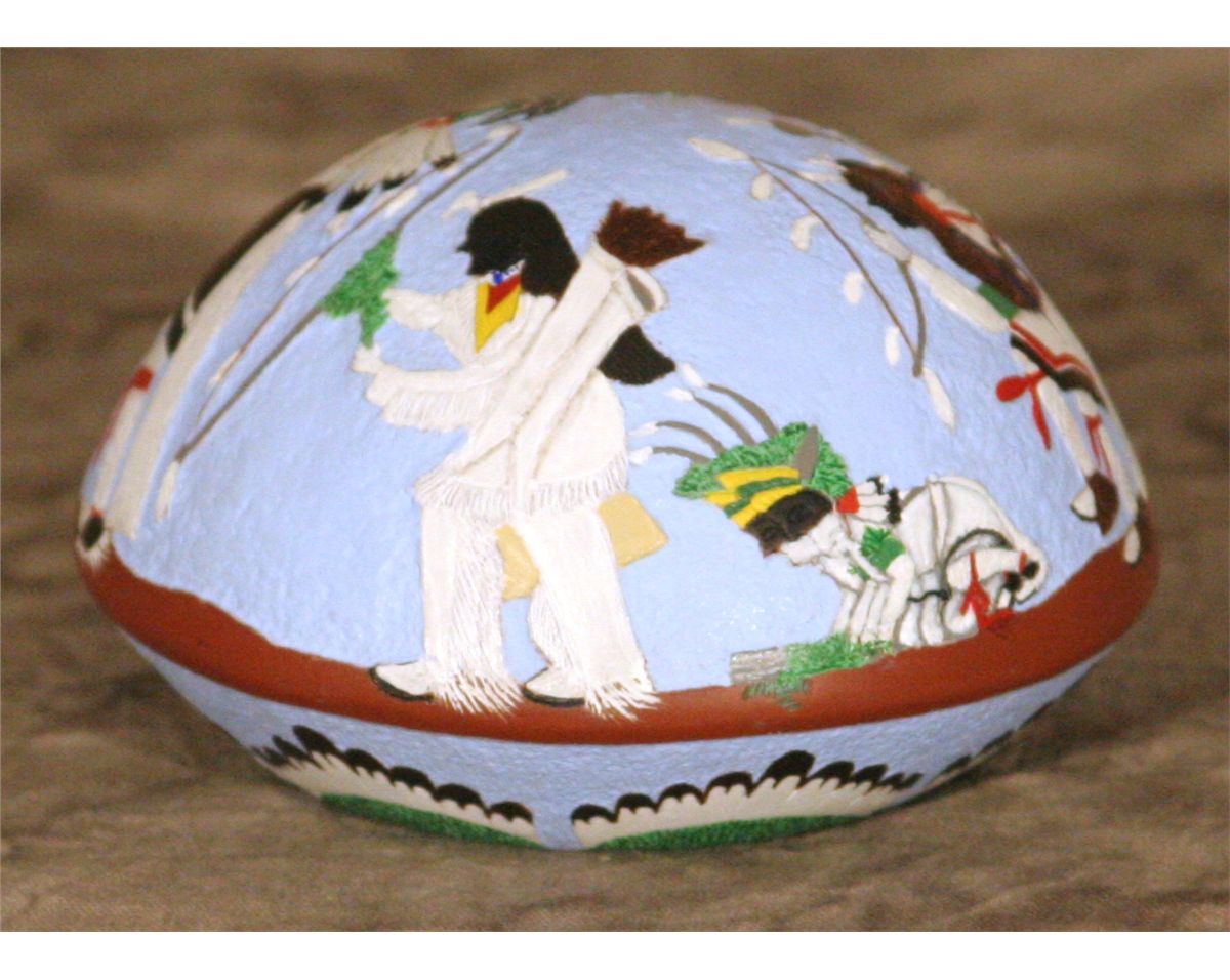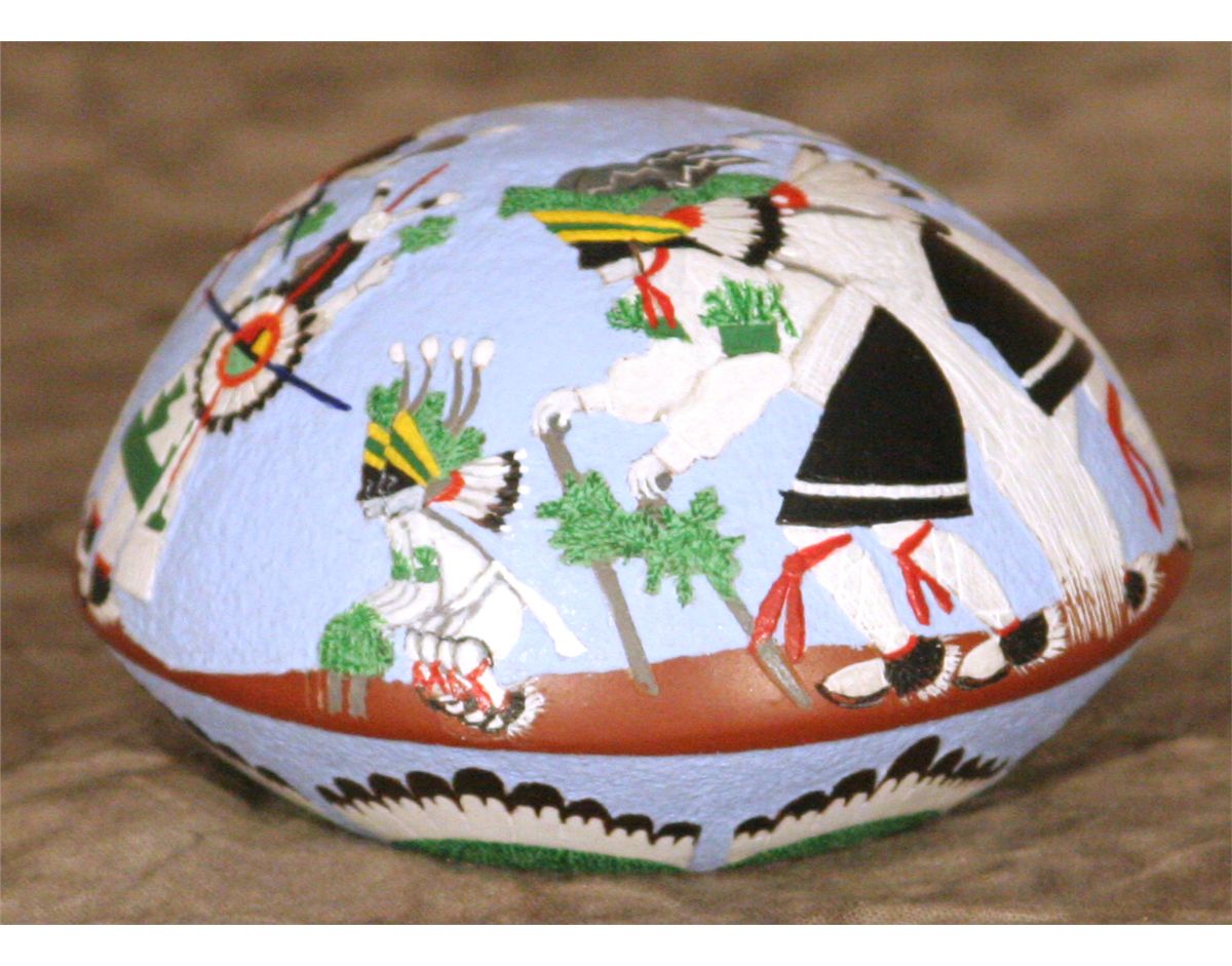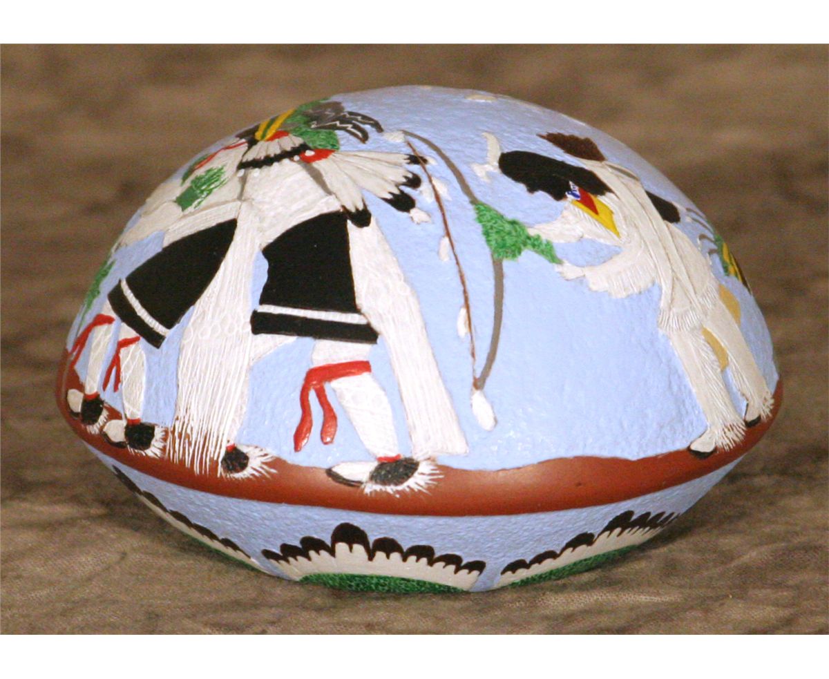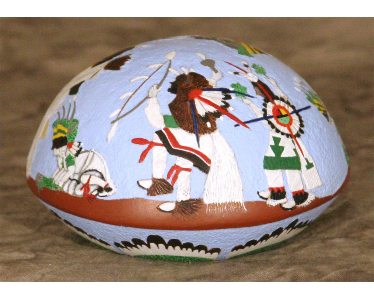 Santa Clara Miniature Seed Pot by Joseph Lonewolf (1932 - ). 2" x 4". Sgraffito carved with a ceremonial dance scene. Intricately painted. Inscribed: Camilio Sunflower Tafoya, Santa Clara Pueblo (to honor his father) JOSEPH LONEWOLF 06LG01 [cypher]. Provenance: Indian River Gallery.