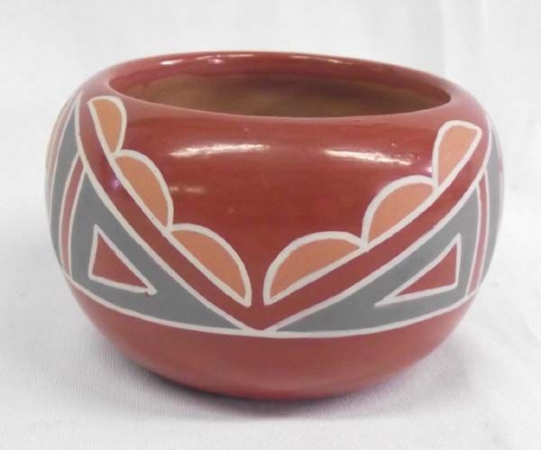 Santa Clara Polychrome Bowl by Anna Archuleta (AKA Eagle Feather and has been making pottery for 30 years), thick walled, gorgeous geometric/abstract designs on highly burnished reddish-brown, signed on bottom ''Anna Archuleta Santa Clara'', measures approx. 4'' x 2.5''