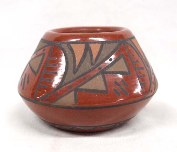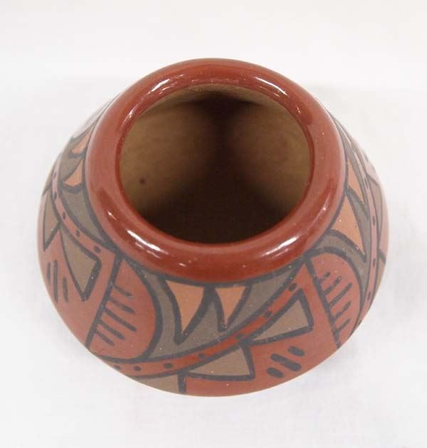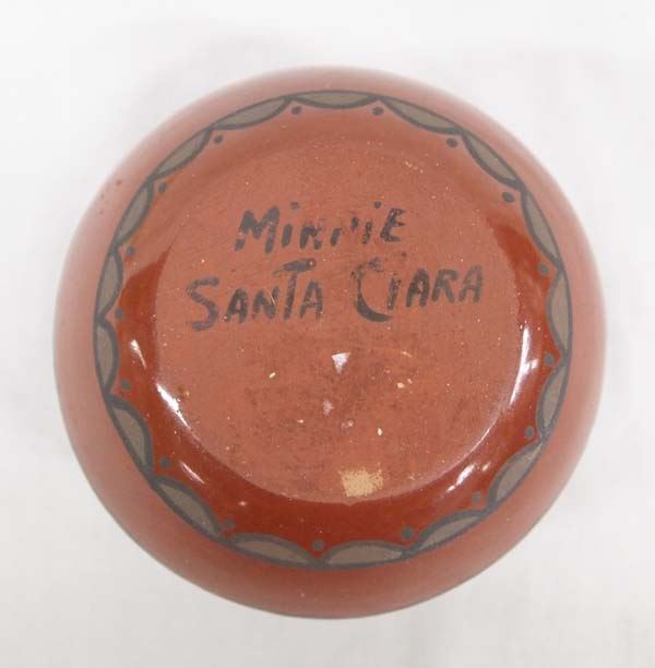 Native American Santa Clara Polychrome Miniature Geometric Jar by Minnie Vigil, measures 2''H x 3''D, signed on bottom by artist