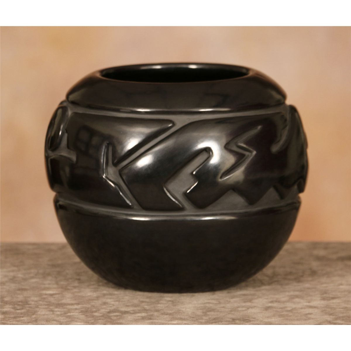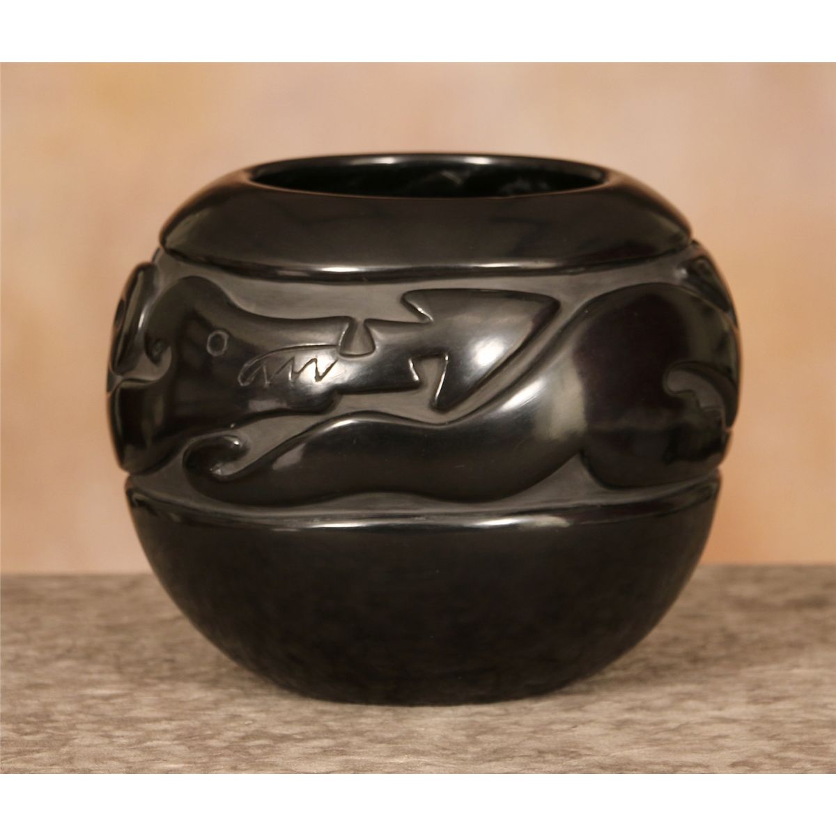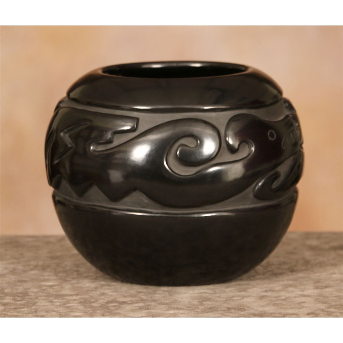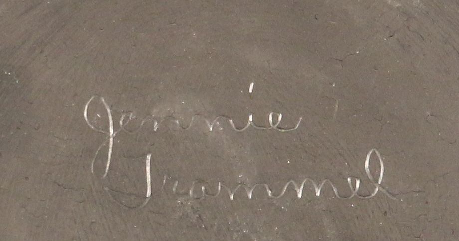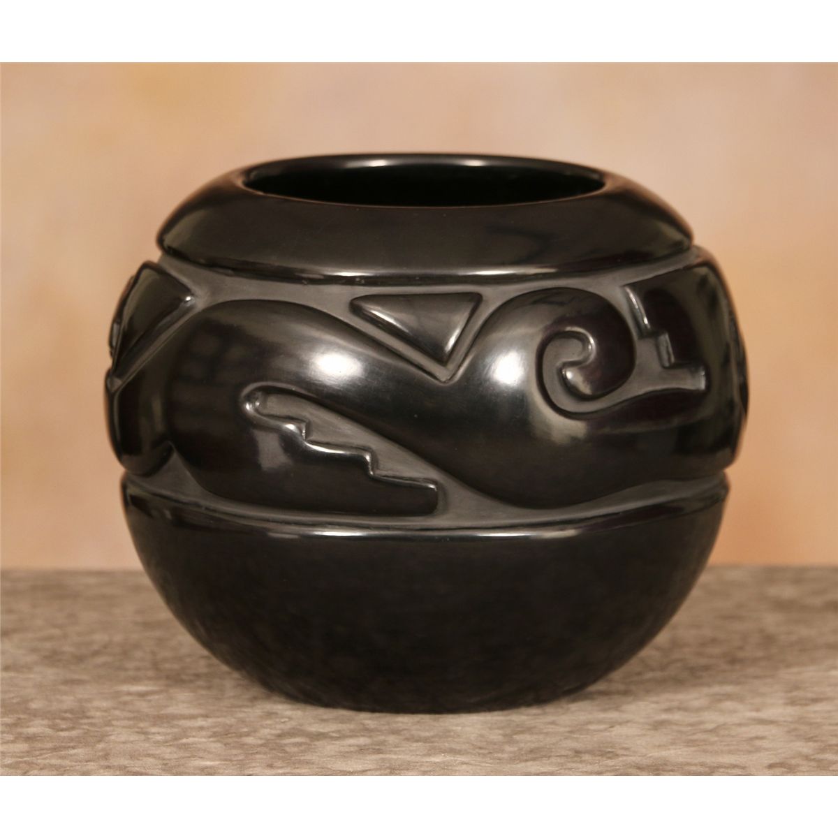Santa Clara Jar by Jennie Trammel (1929 -2010). 6.5" x 8.5". Blackware jar with a heavily carved Avanyu design. Signed on base: Jennie Trammel. Of all Margaret Tafoya's daughters, Jennie's works are the hardest to find. This is a perfect example of her master artistry. Provenance: Indian River Gallery.