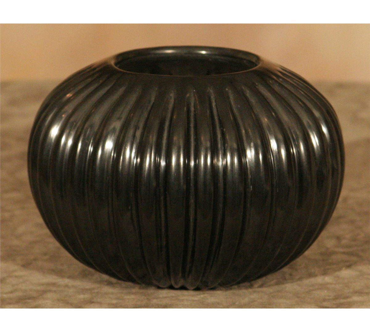 Santa Clara Pot by Alton Komalestewa (1959 - ). 4" x 5.5". Blackware melon pot. Delicate and difficult to execute. Inscribed: Alton Komalestewa.