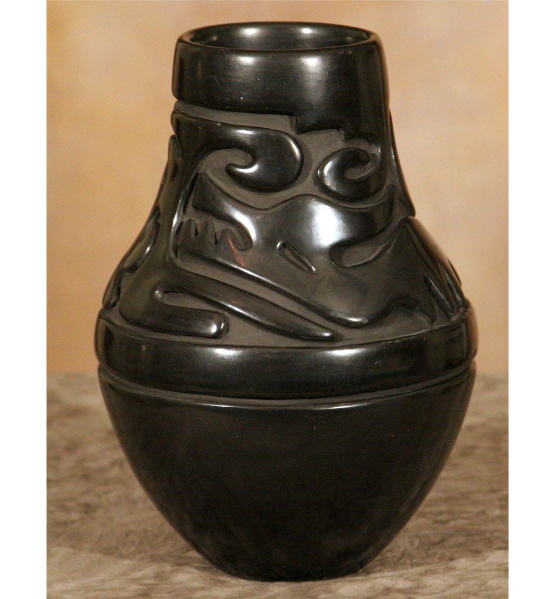 Santa Clara Pot by Teresita Naranjo (1919-1999). 8.5" x 6". Blackware pot with deeply carved Avanyu design. Inscribed: Teresita Naranjo, Santa Clara, Pueblo.