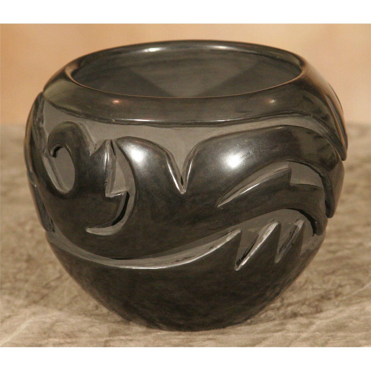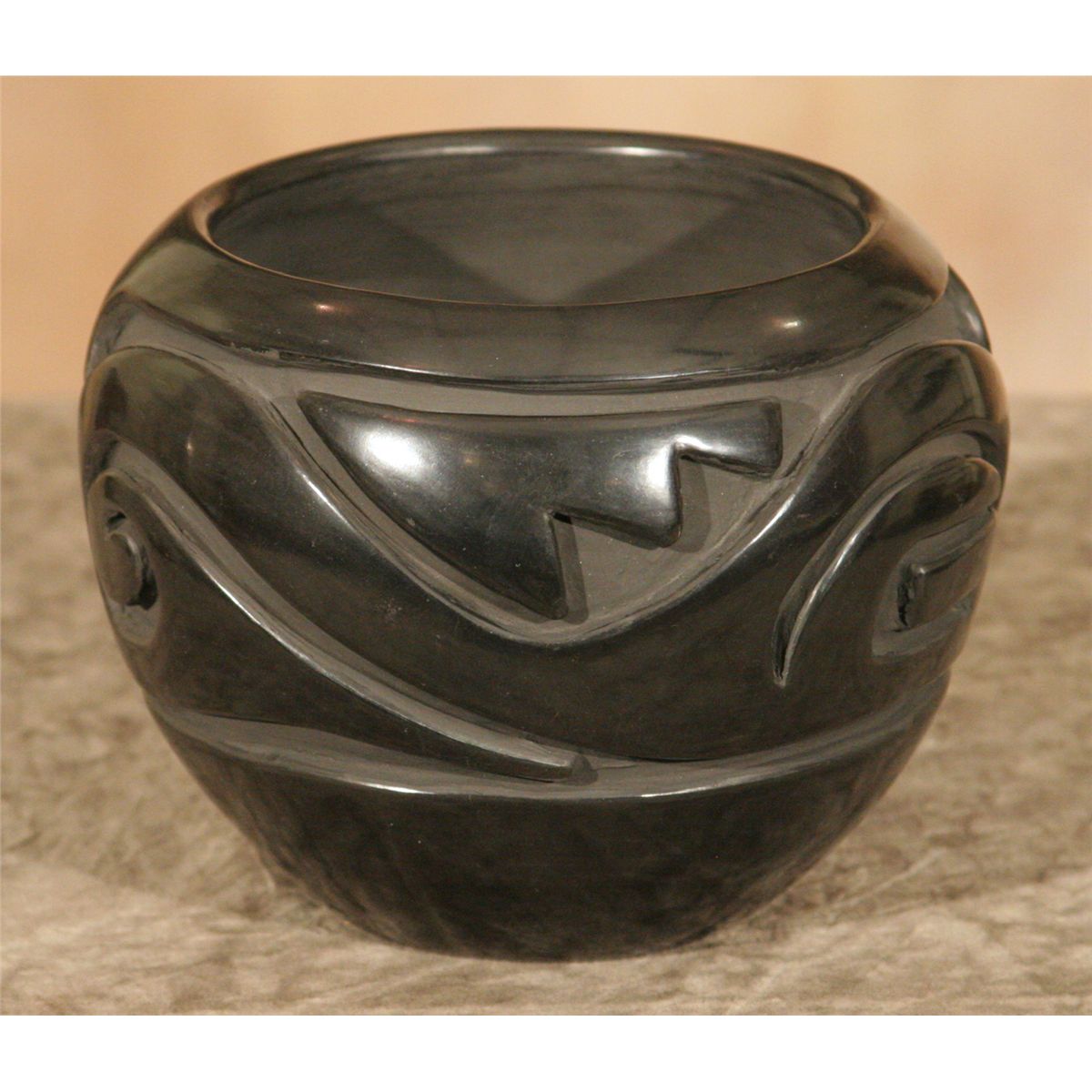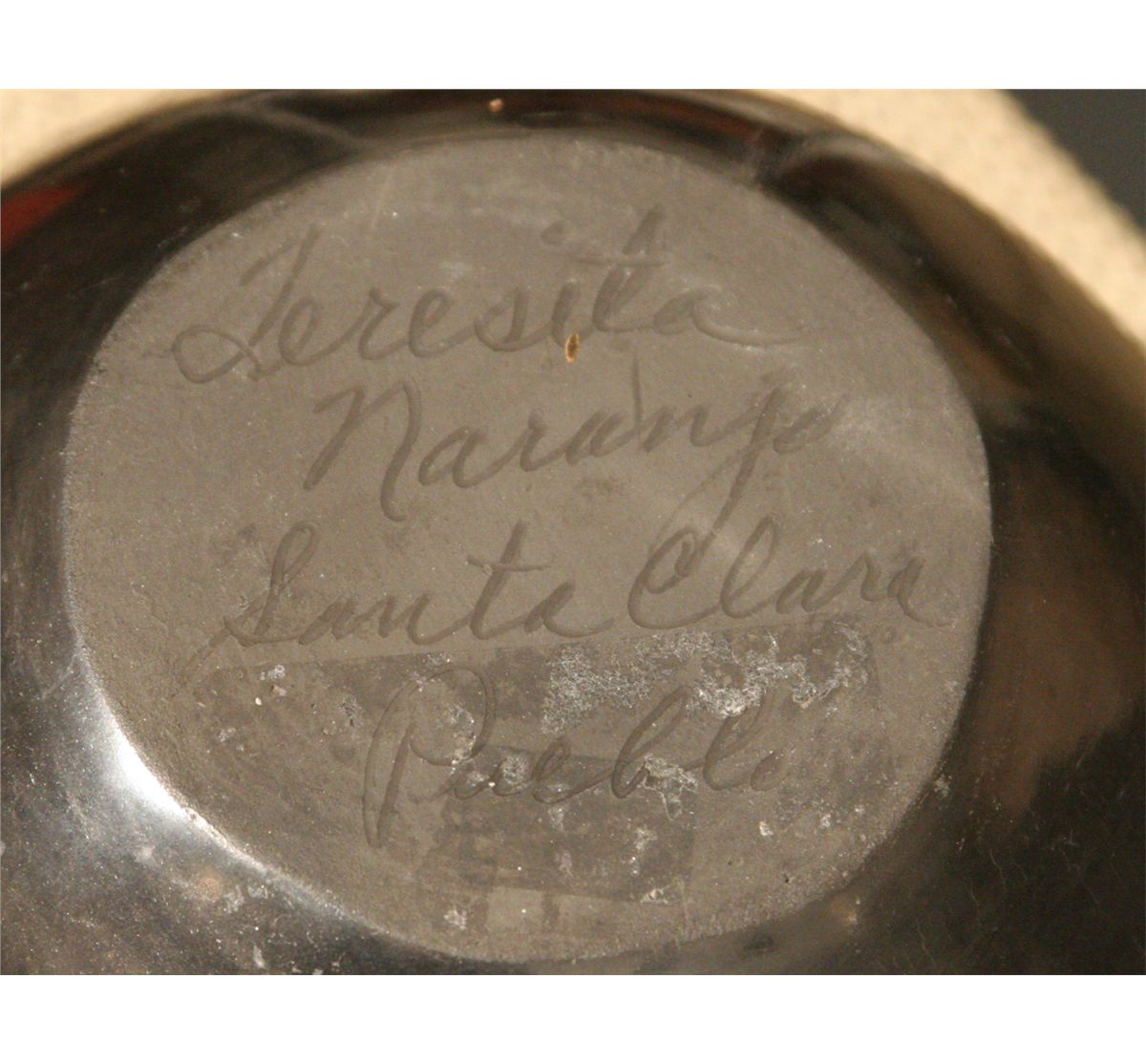 Santa Clara Pot by Teresita Naranjo (1919-1999). 5" x 7". Blackware pot with deeply carved body. Inscribed: Teresita Naranjo, Santa Clara, Pueblo.