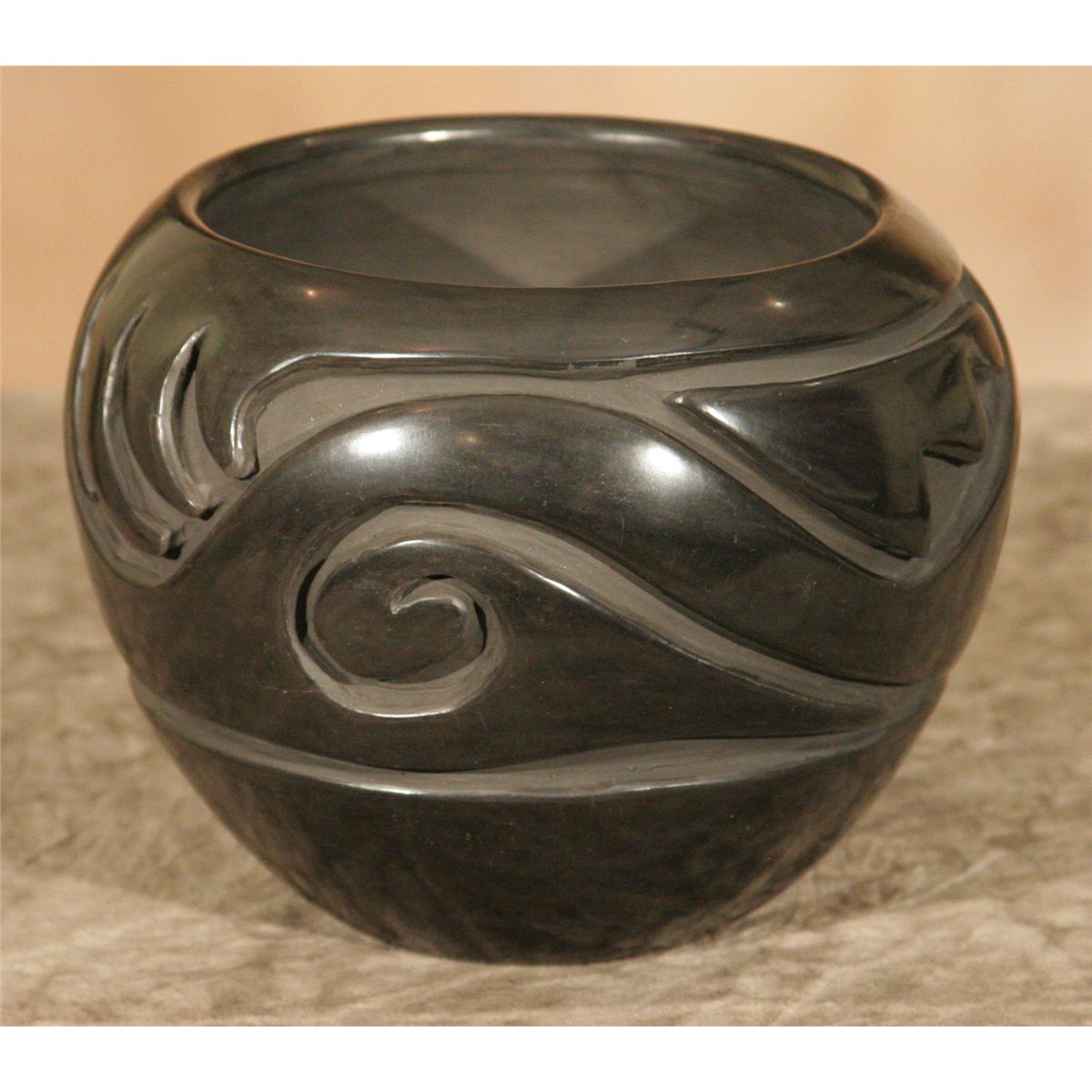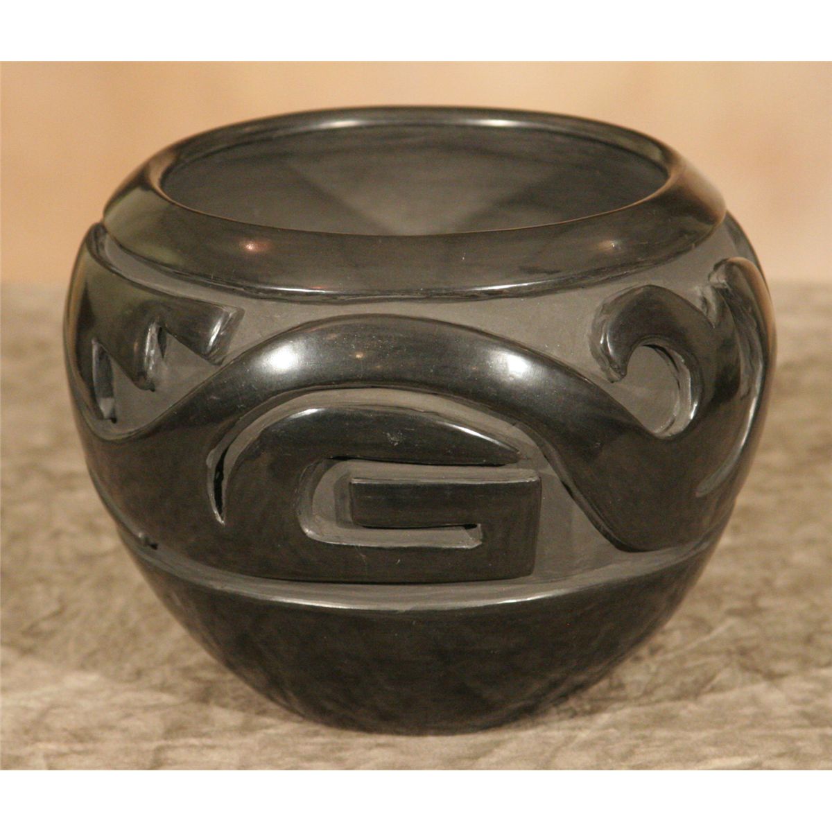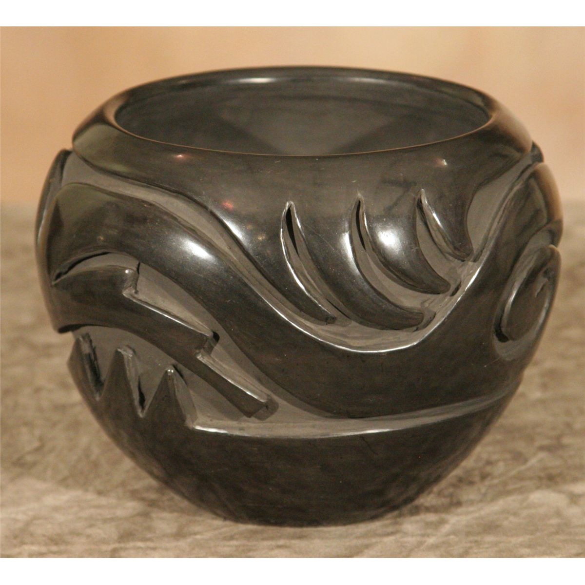 Santa Clara Pot by Teresita Naranjo (1919-1999). 5" x 7". Blackware pot with deeply carved body. Inscribed: Teresita Naranjo, Santa Clara, Pueblo.