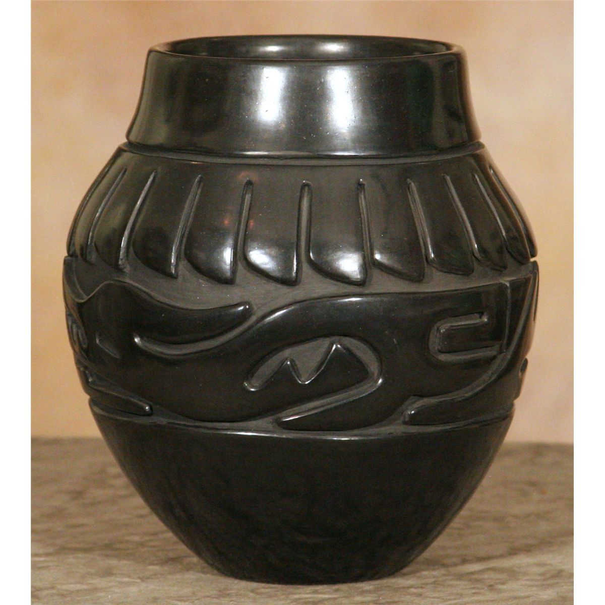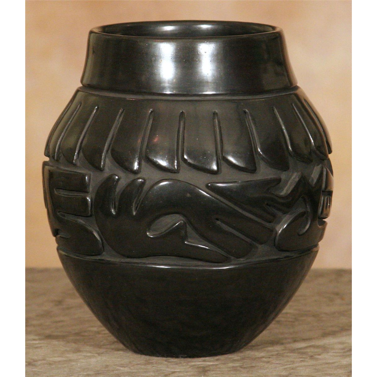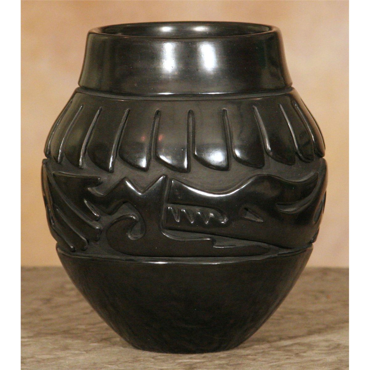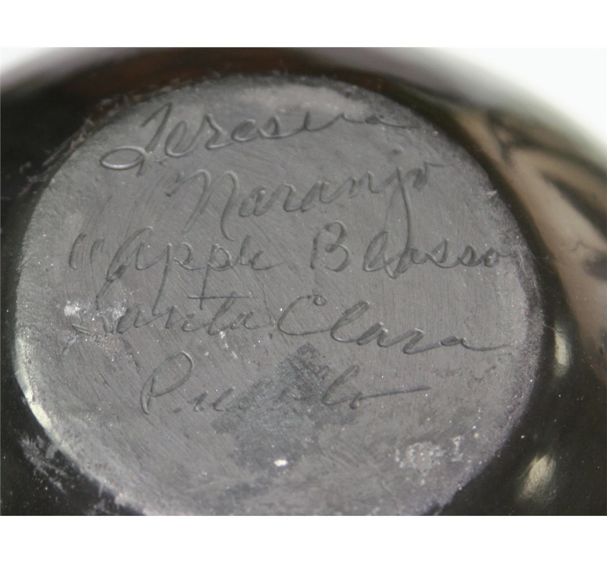 Santa Clara Pot by Teresita Naranjo (1919-1999). 8" x 7". Blackware pot with carved Avanyu and stylized feather design. An exceptional piece of work by this artist. Inscribed: Teresita Naranjo, "Apple Blossom", Santa Clara Pueblo.