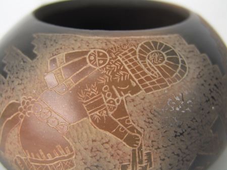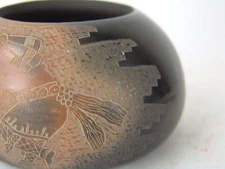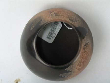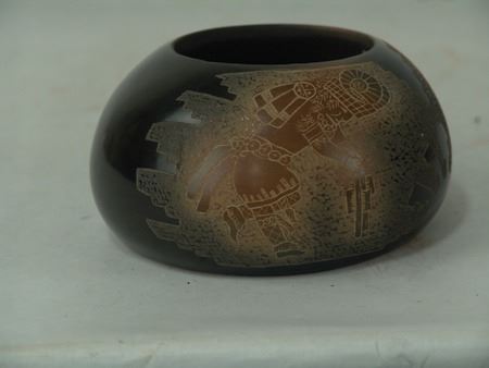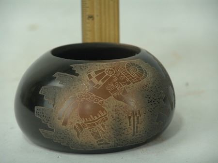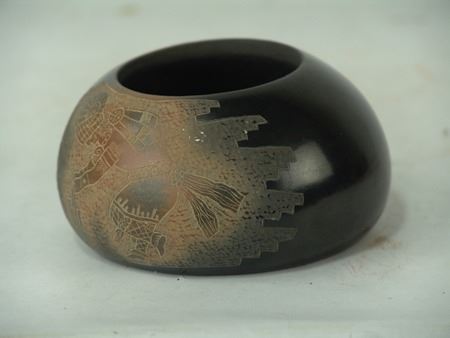 Late 1900s, Fine uniquely shaped duo-tone bowl with detailed sgraffitto work depicting opposed sheep/ram dancers. Very good condition, minor surface scratches. 2-1/2" x 4-3/4"