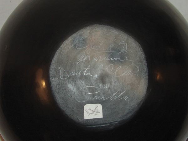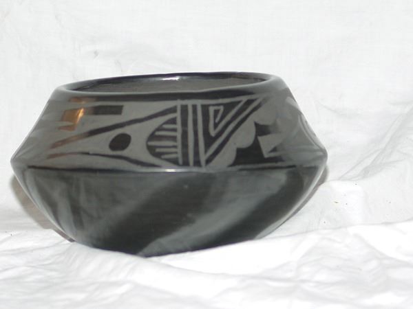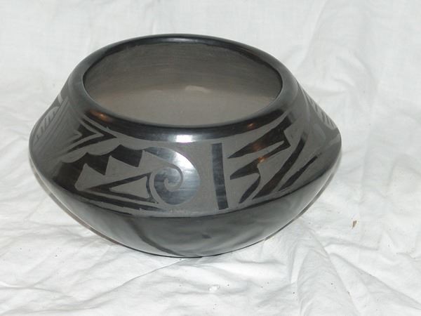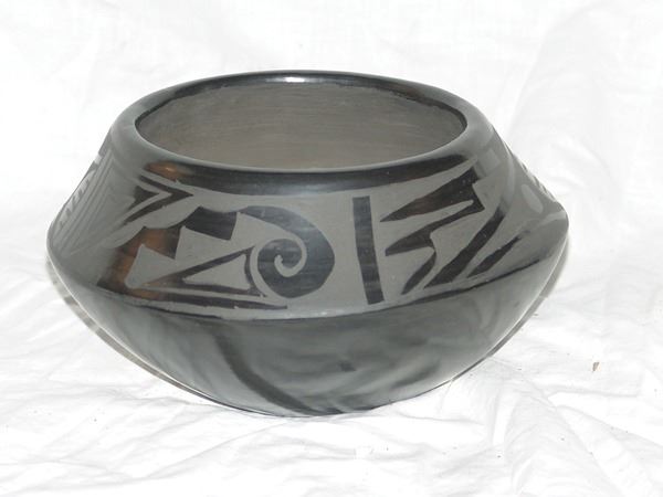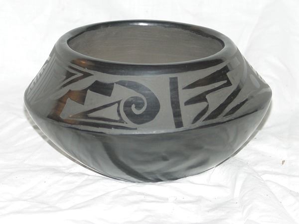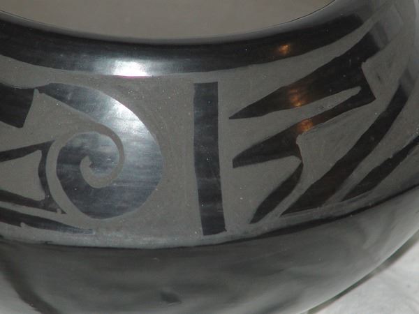 Mid/Late 1900s 4-1/2" x 9" Beautiful, black-on-black, wide mouthed jar/bowl with avian inspired shoulder design band. Very good condition.