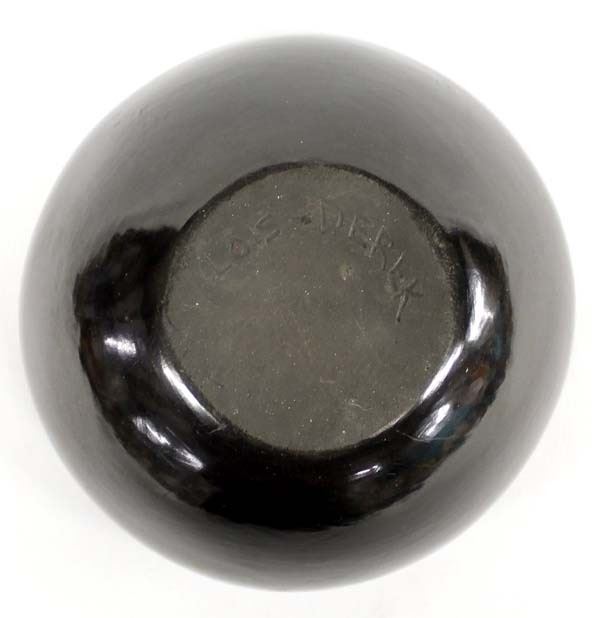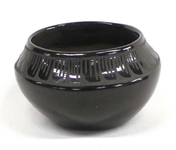Native American Santa Clara Carved Pottery Bowl by Lois Gutierrez and Derek de la Cruz, measures 2.5'' x 4.5'' and is signed on the bottom, beautiful stylized feather designs, FYI: ''Born in 1948, Lois Gutierrez married Derek de la Cruz many years ago and they've been working together since: Lois does most of the potting and painting while Derek works with the clay and helps with the firing. One of their collaborations took the Best of Show ribbon at the Santa Fe Indian Market in 1982.''