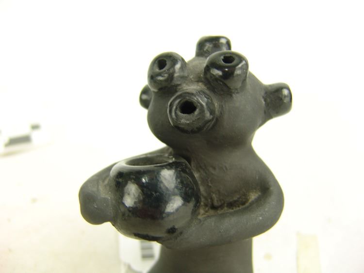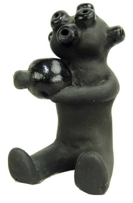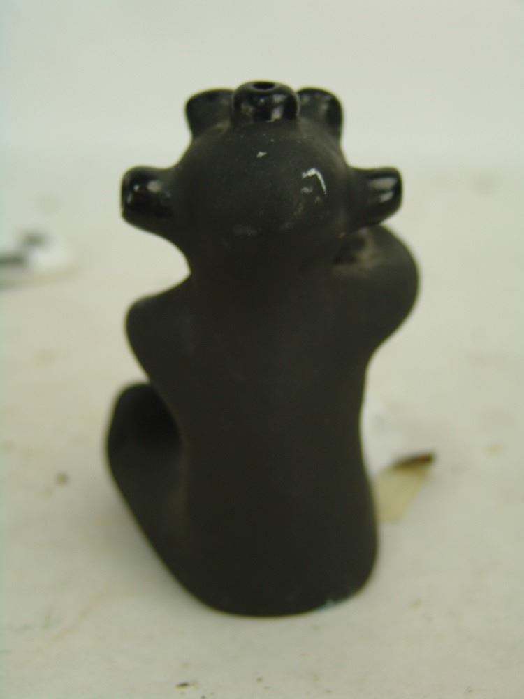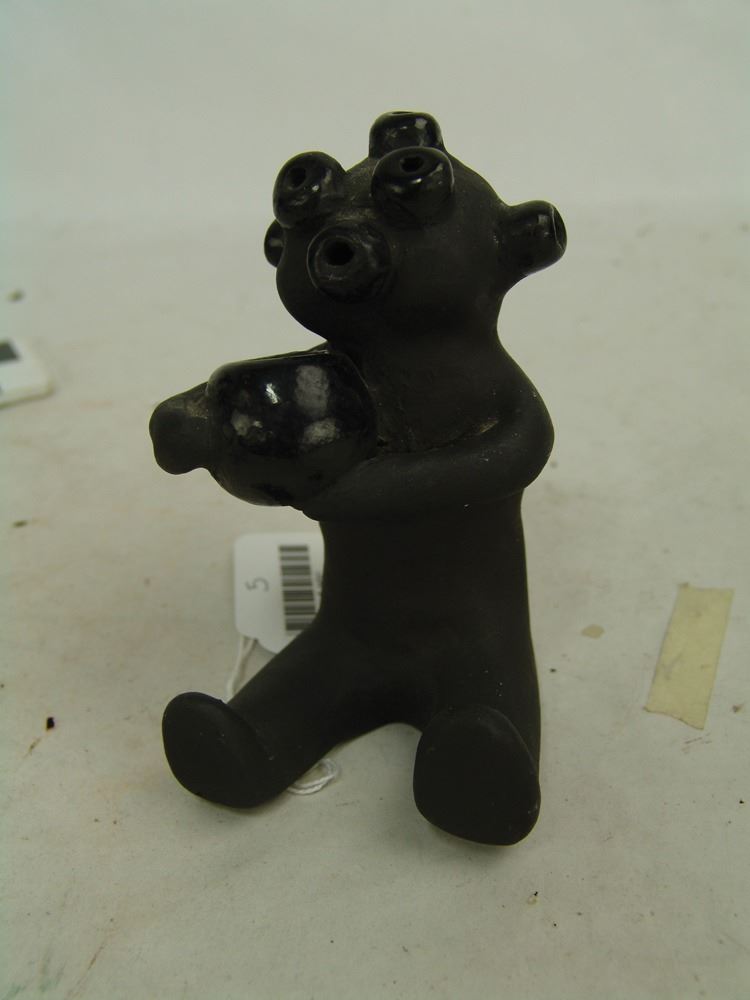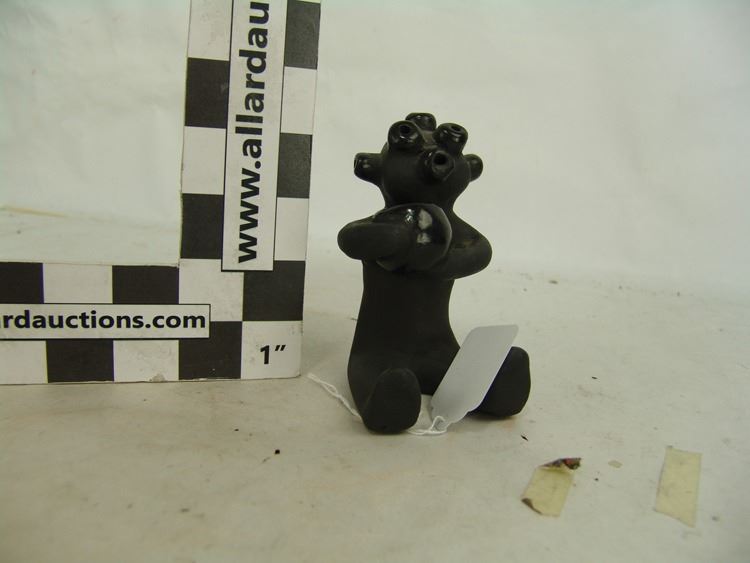 Small seated black matte pottery mudhead figure with glazed features and shown holding a bowl. Very good condition, minor scuffs.,Ca. 1980s,5"