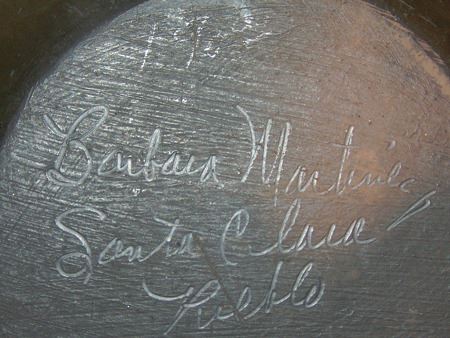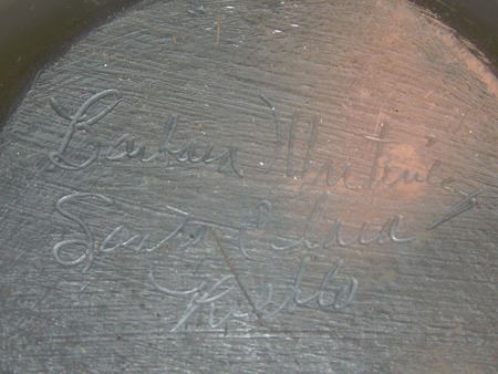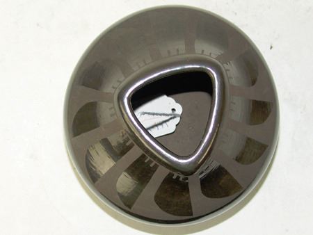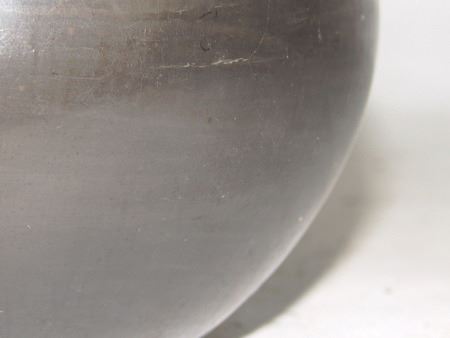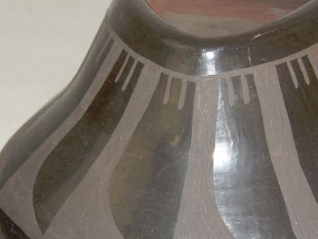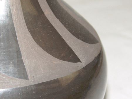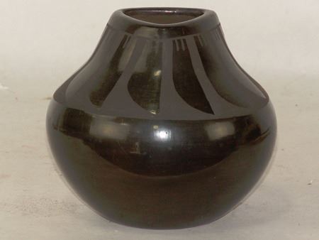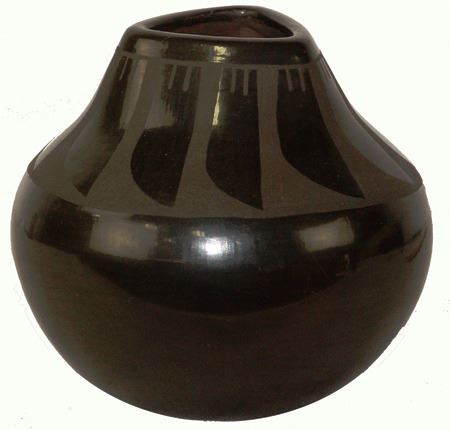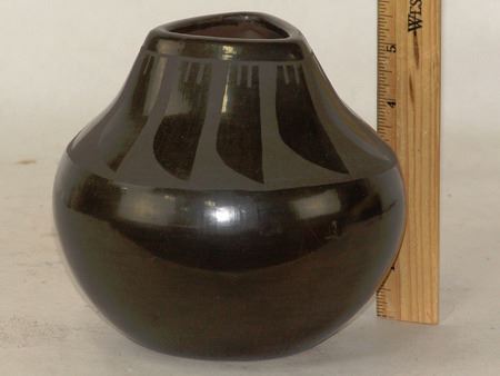 Late 1900s, Unique black-on-black pottery jar with feather design and triangular rim. 6" x 6"