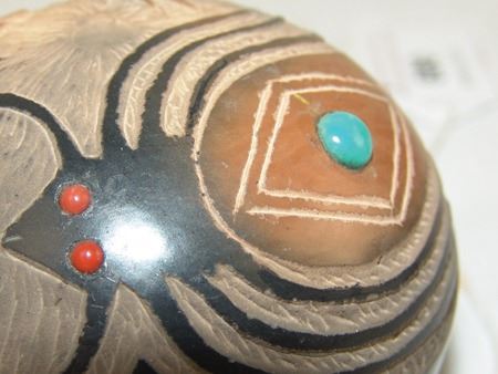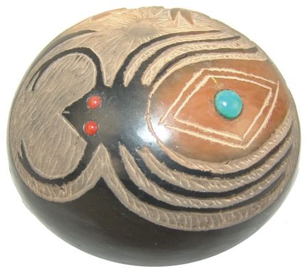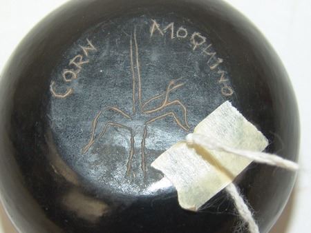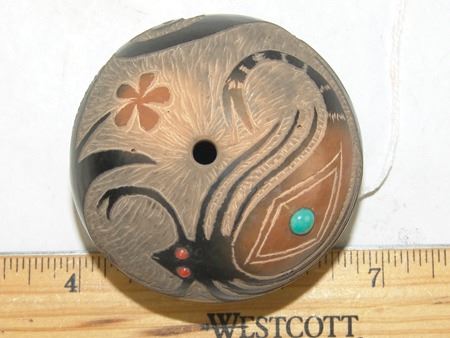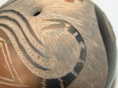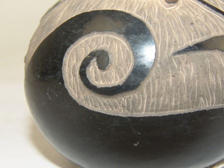 Late 1900s, Very fine tan/black miniature sgraffitto seed pot with large creature. Very good condition. 2" x 2-3/4"