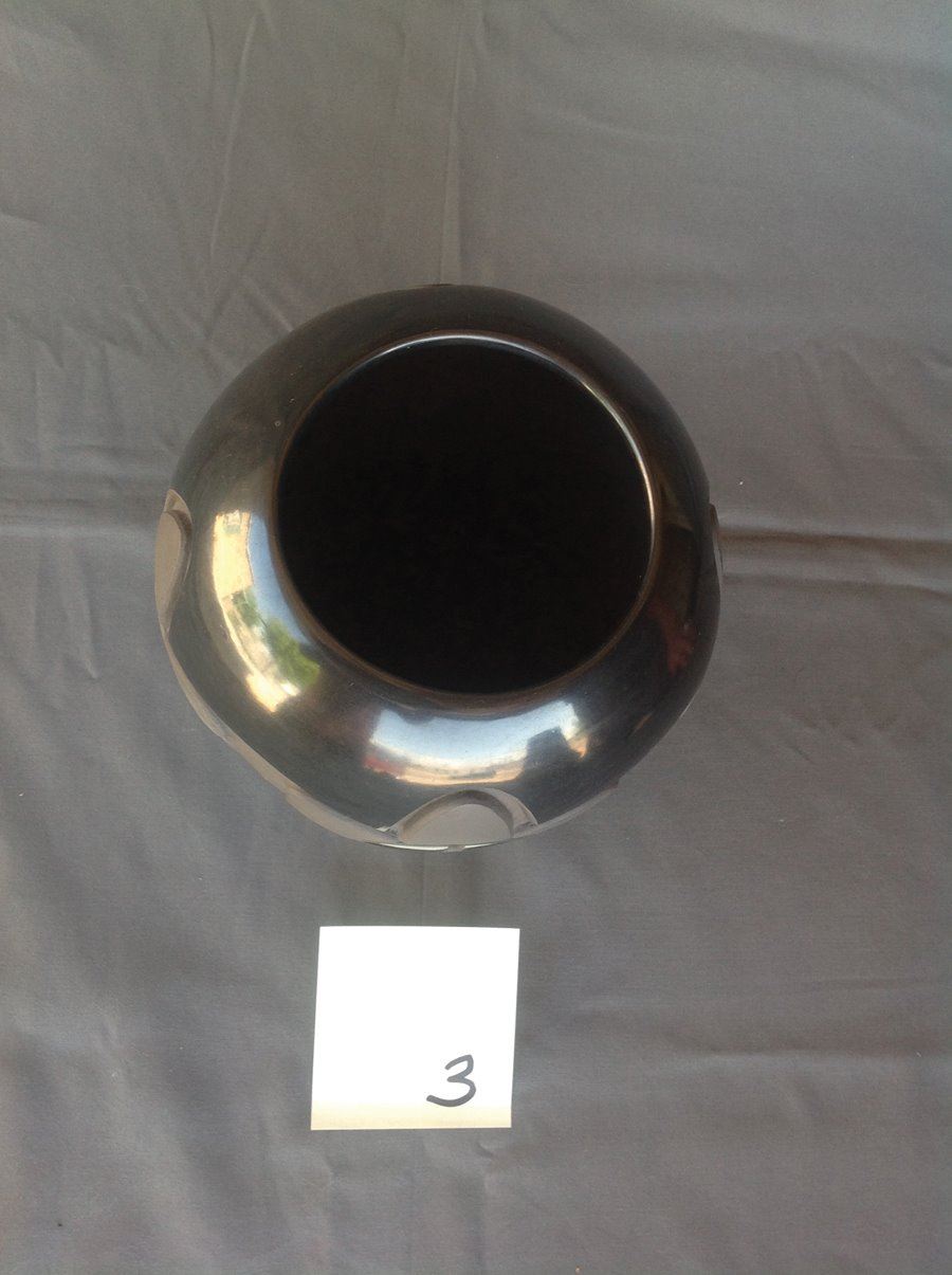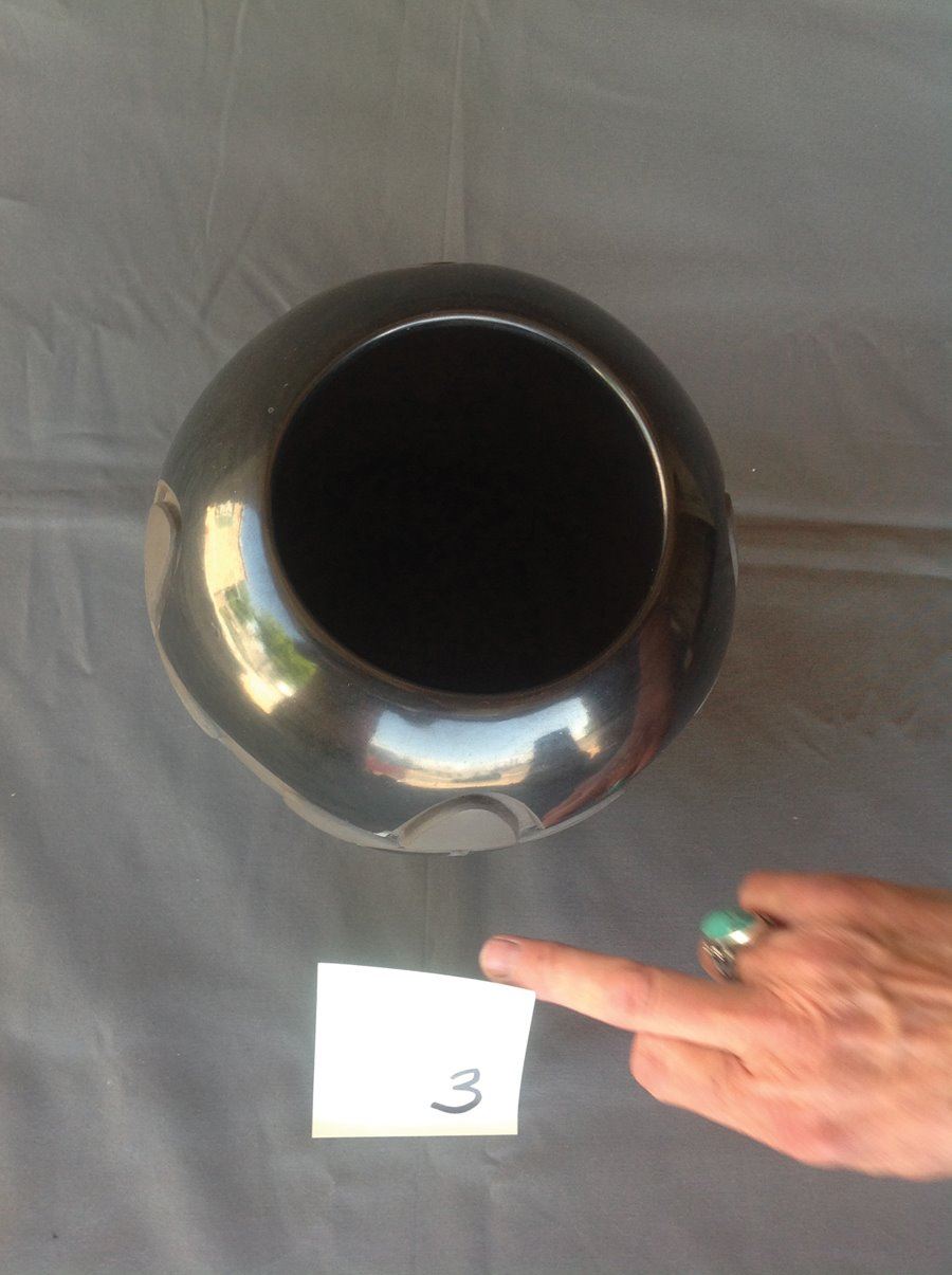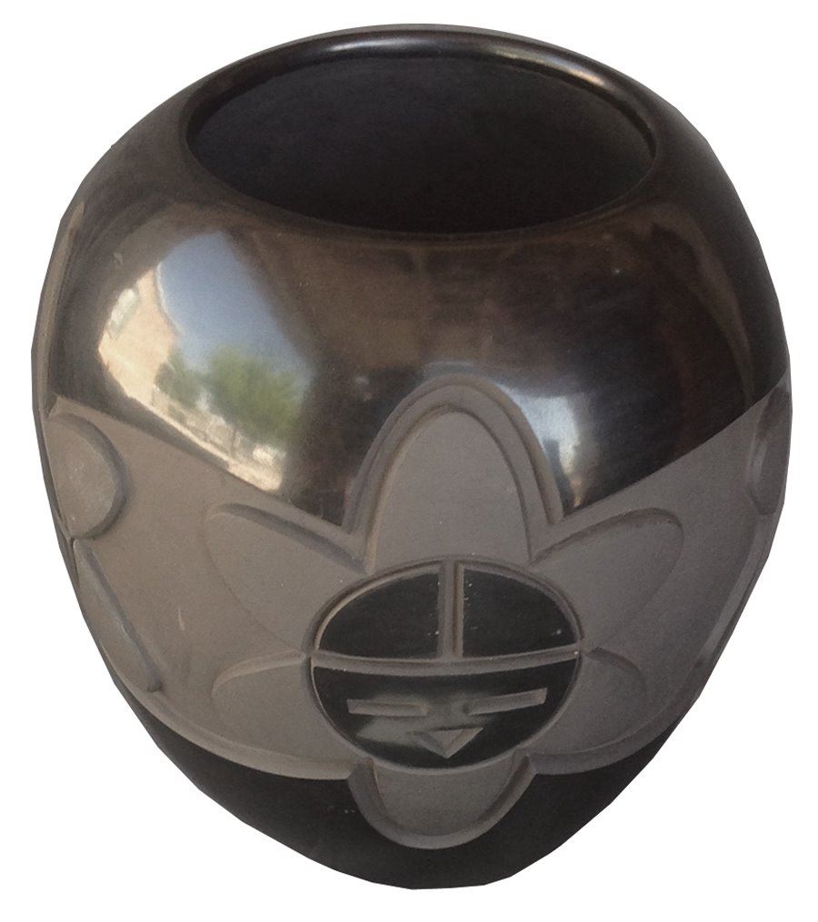 Classic black-on-black jar with deep carved section containing a sun face figure. Good condition.,,7" x 8"