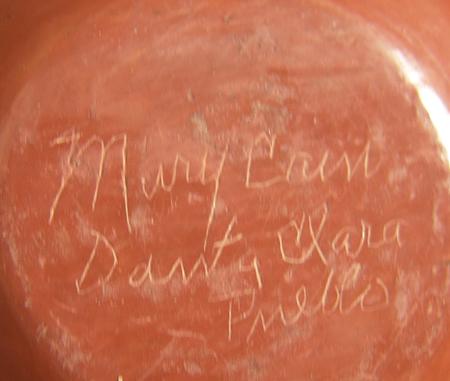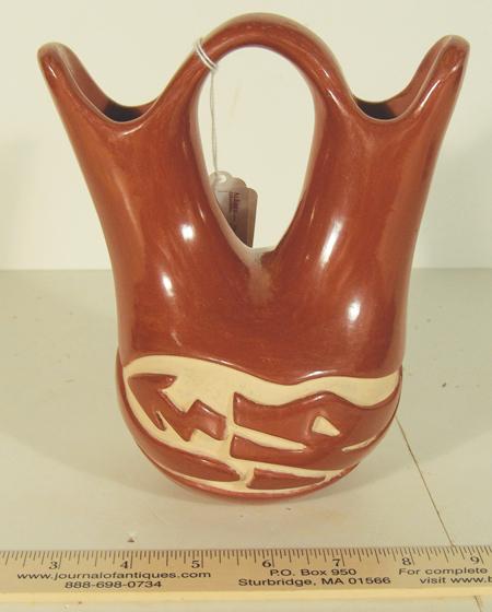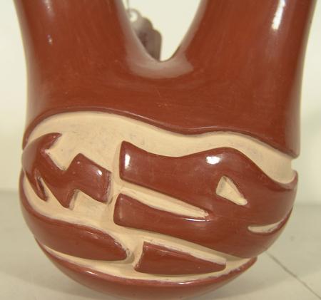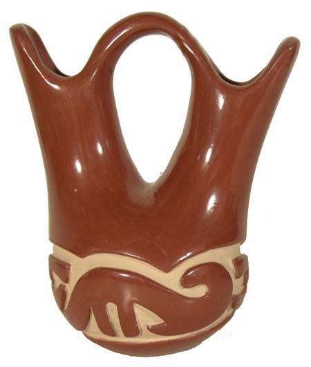 Beautiful redware double necked wedding vase with deep carved and painted body showing the avenyu spirit figure. Condition: very good. 8" high