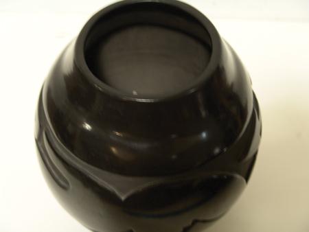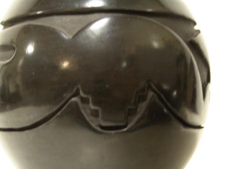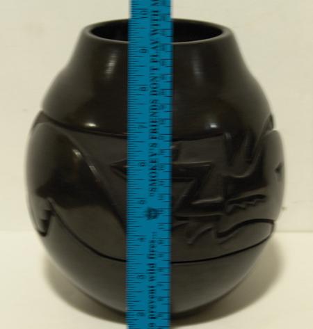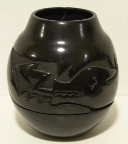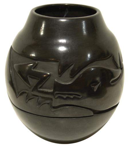 Circa 1960, Exceptional black polished jar with Avanyu deeply incised. Excellent condition. 9" x 7-1/2"