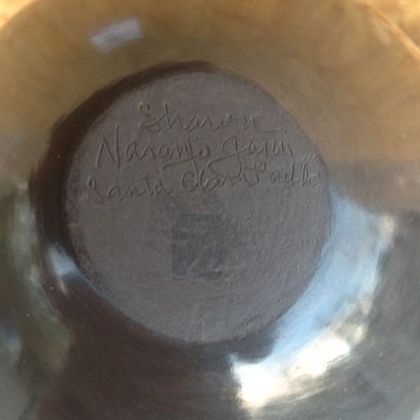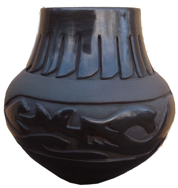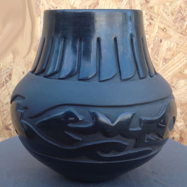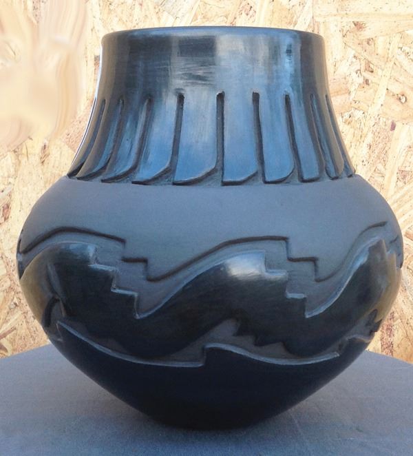 Ca. 1980s 7" x 7-1/2" Graceful, deep carved blackwarejar with traditional Avanyu serpant figure around the body, and radiating feathers below the rim. Very good condition.