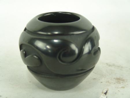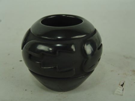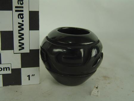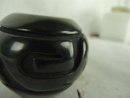 Ca.1980s, Small deep carved blackware pottery jar with traditional motif. Very good condition. 3-1/2" x 4"