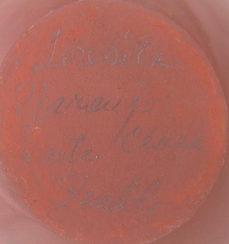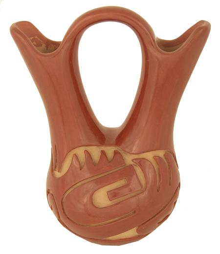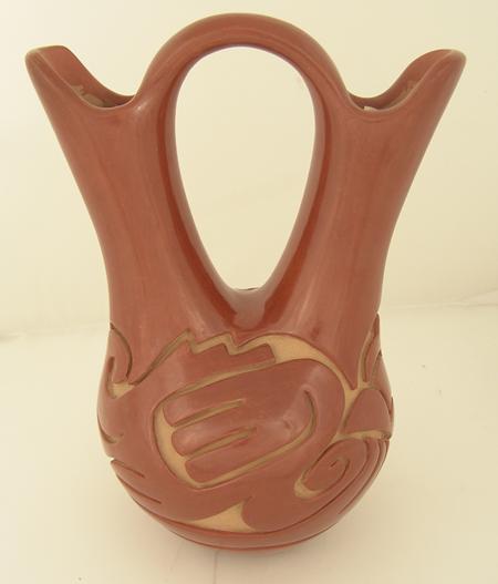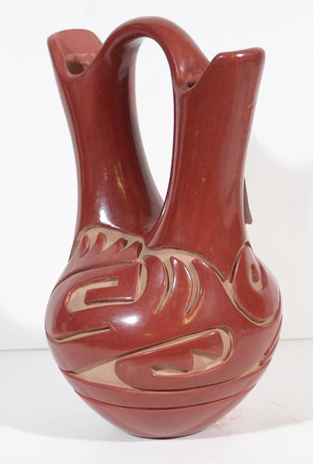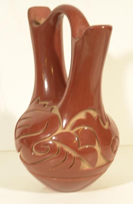 Beautiful, deep-carved double-necked redware wedding vase. Signed. Purchased from maker in 1974 for $250; appraisal value $8500. Condition: very good, 1 hairline crack. 12" high x 8-1/2" diameter