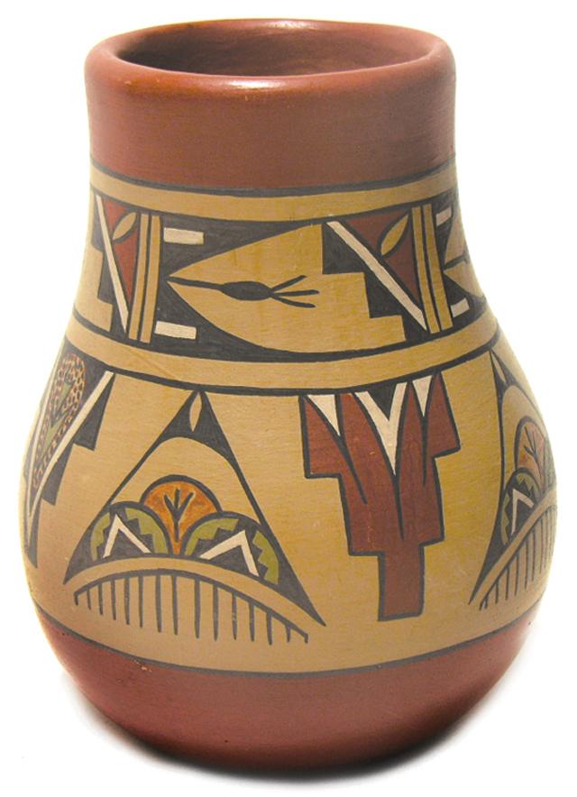 Circa 1970, Margaret & Luther, Fabulous jar with polychrome rain and mountain symbols; pristine condition. 6-1/4" x 5"