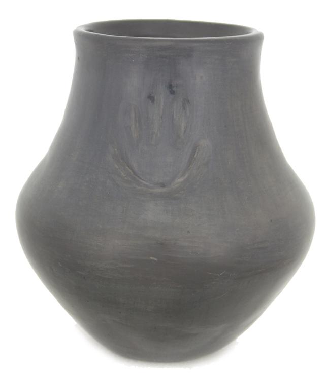 Mid 1900s, Beautiful wide-mouthed blackware olla with rock polished finish and bear paw impressions - unsigned. 8" x 7-1/2"
