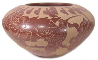 Gwen Tafoya, Exquisite redware sgraffitto pottery jar covered with roses and a hummingbird. 3-3/4" x 7-1/2"