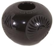 Minnie (Vigil), Beautiful matte black-on-black pottery jar with sun and cloud designs; very good condition. 4-1/2" x 6"
