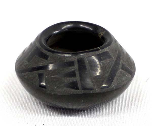 Native American Santa Clara Pottery Miniature by Annie Baca, measures 2.25'' x 1.25'' and is signed on the bottom, FYI: ''Annie Baca is a daughter of noted potter Cresencia Tafoya (1918-99). Annie is known for her miniature pottery with highly polished surfaces and tightly painted designs. In recent years Annie has worked in the casinos of the Espanola Valley and seldom finds time to pot. She pots during her time off and the resulting scarcity of her pottery only adds to its appeal.''