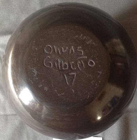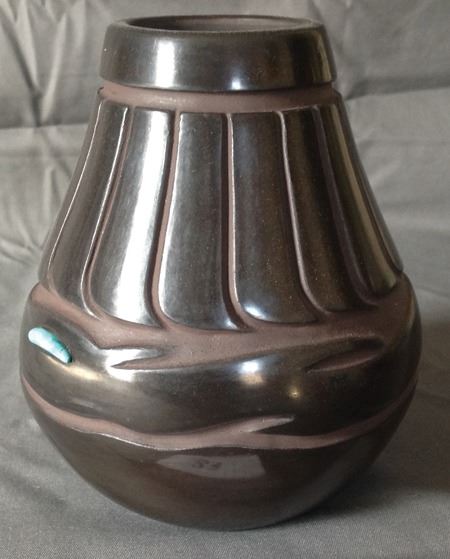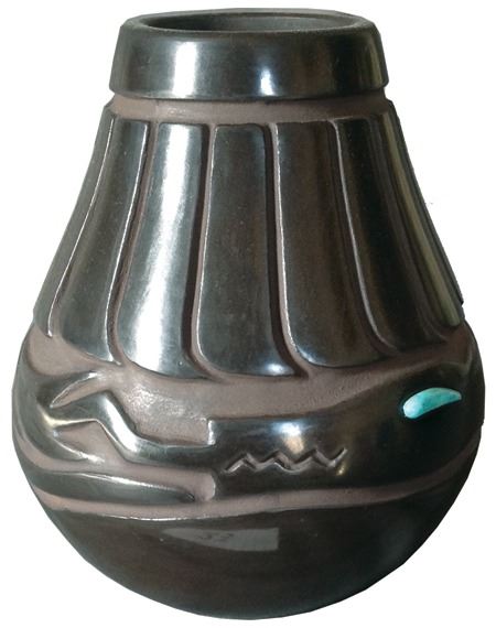 Ca. 2017, Deep carved Santa Clara Pueblo pottery jar with Avanyu serpent and inset turquoise stones. Very good condition. Signed. 7-1/4" x 6-1/2"