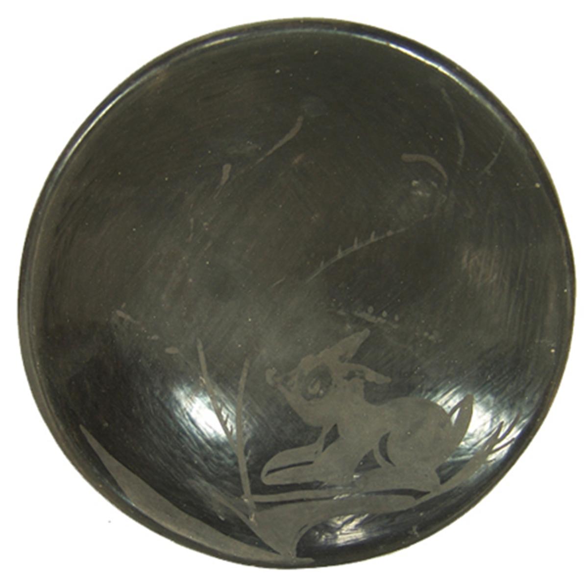Small black-on-black pottery plate showing a fawn under a tree. Signed "Marie Santa Clara". Condition: very good. 6-1/4" x 1"