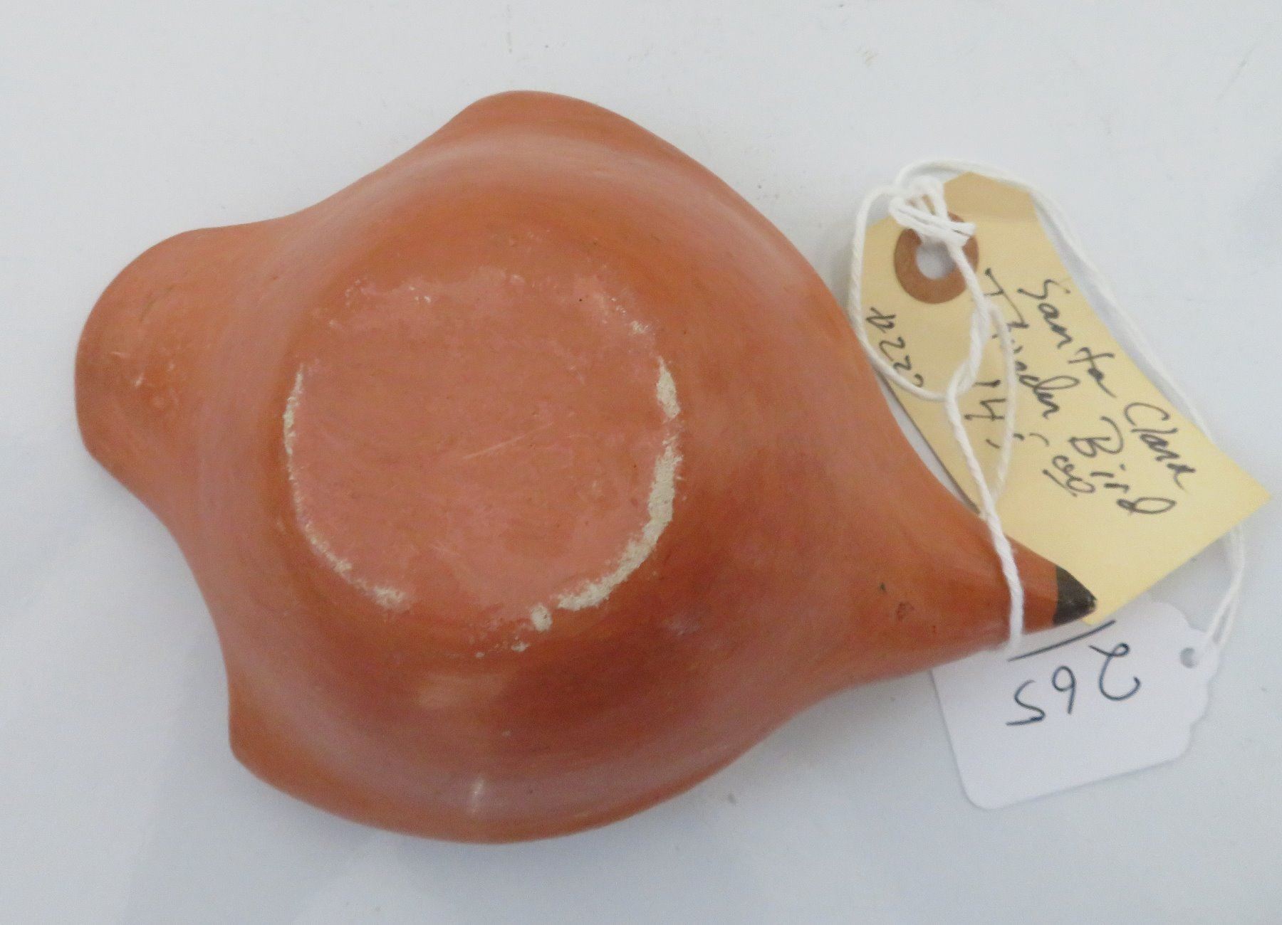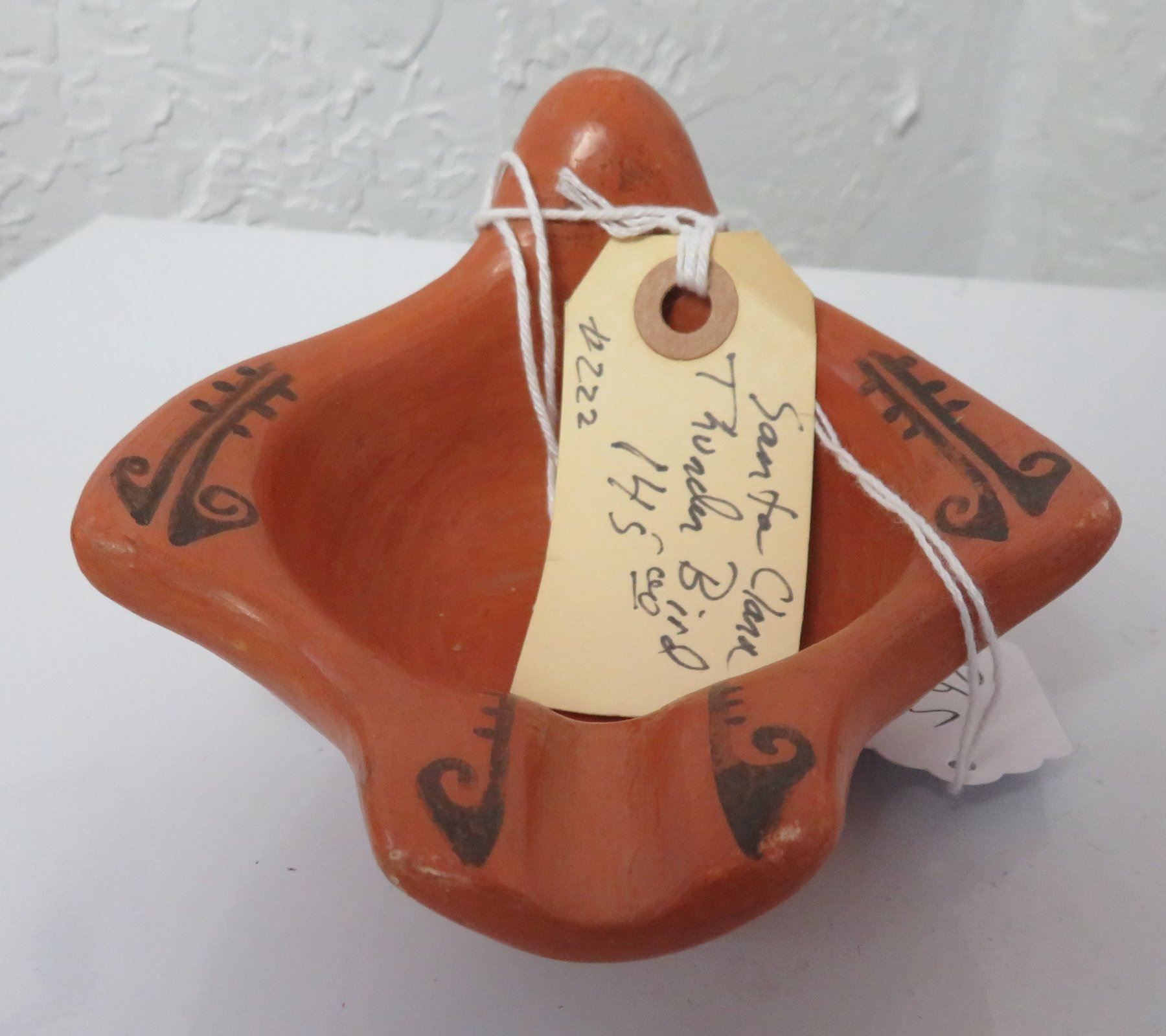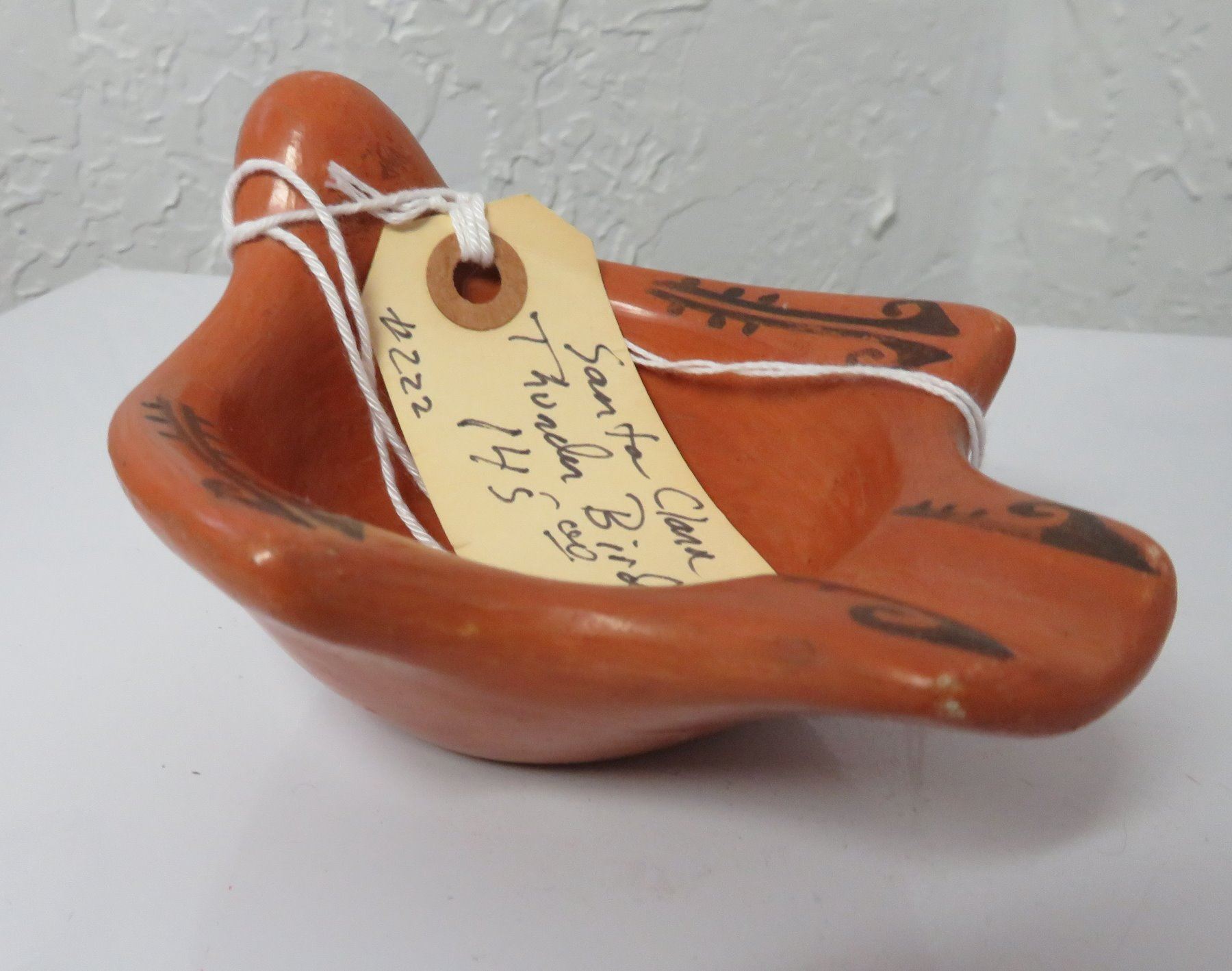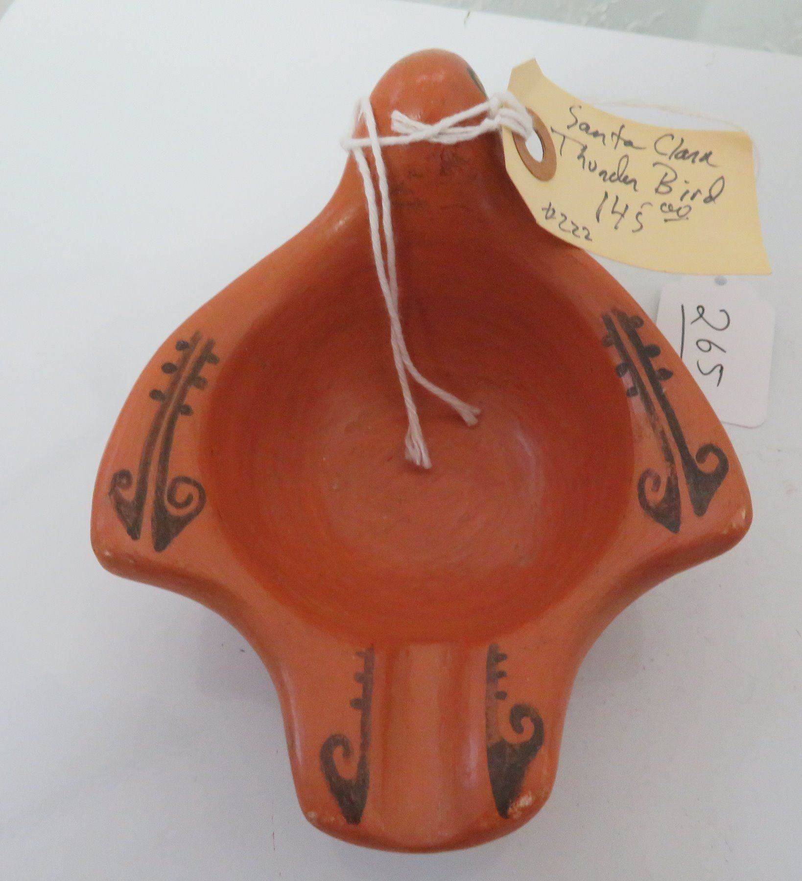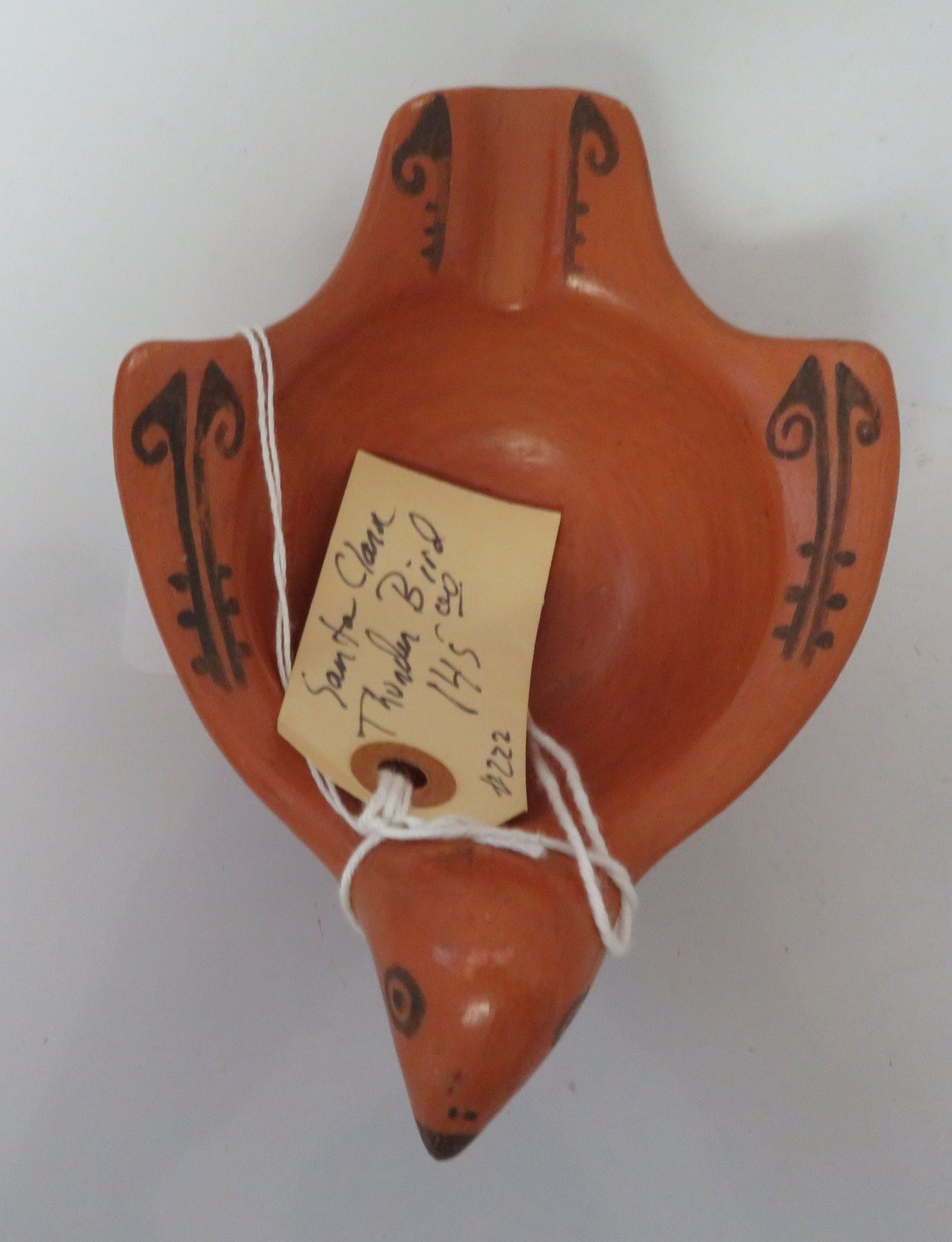 Santa Clara Pottery Thunderbird, c. 1960s. Made of clay and paint, the item measures 6" x 4 3/8" x 2 3/4". Santa Clara Pueblo, New Mexico. Nice paint and form to this classic, Santa Clara thunderbird. Condition: Good, see images. Shipping: $17.50 w/insurance and signature, double-boxed.