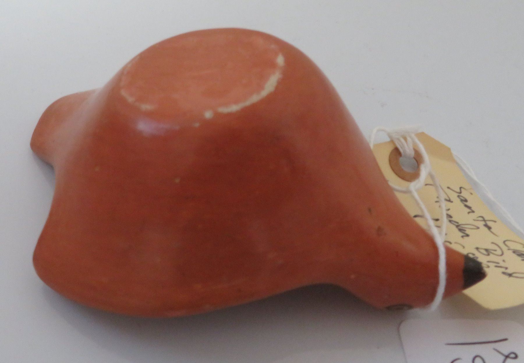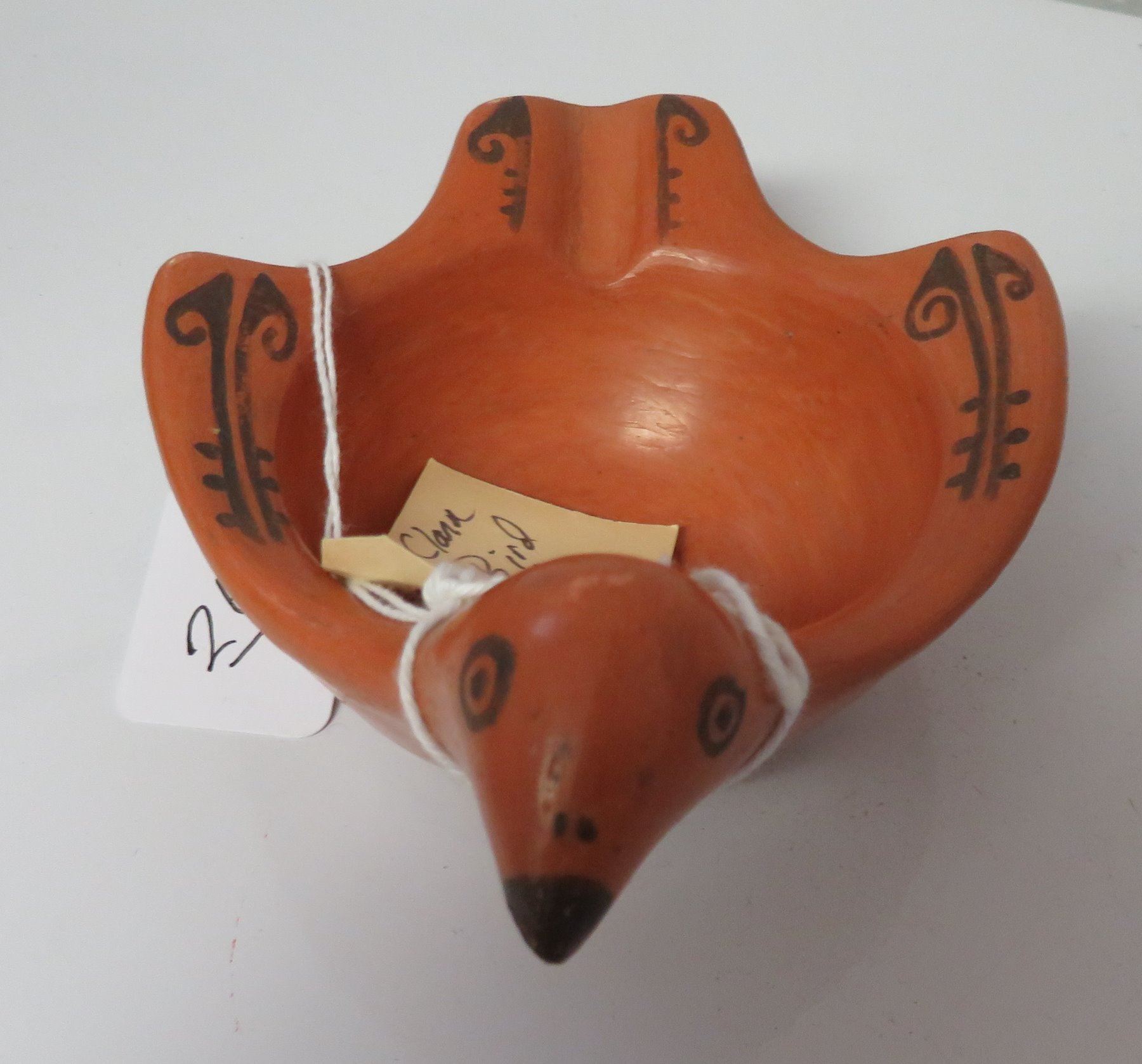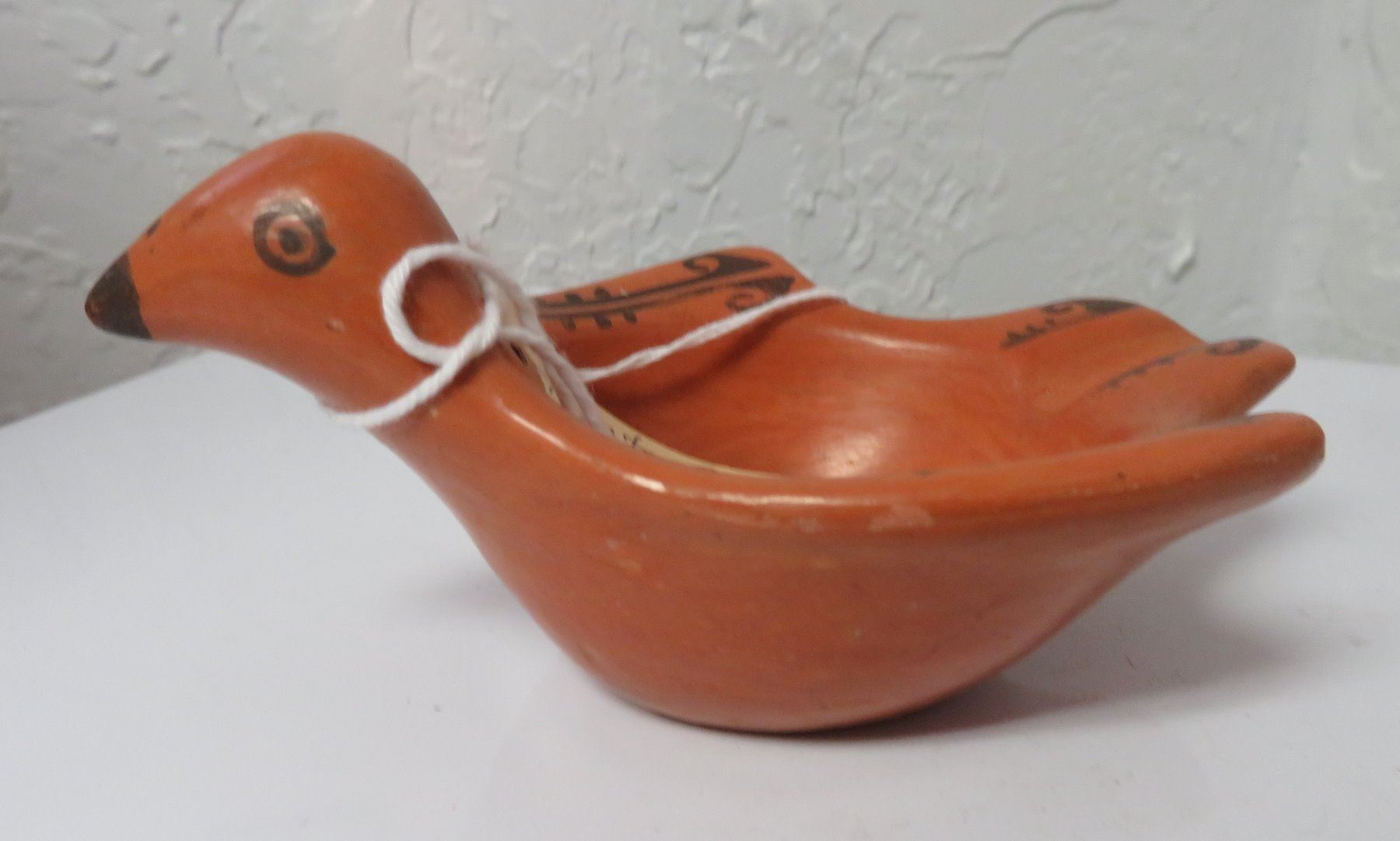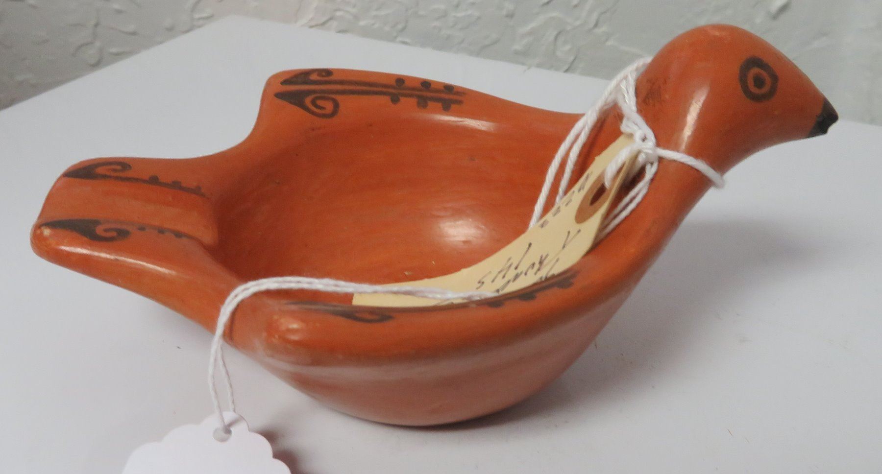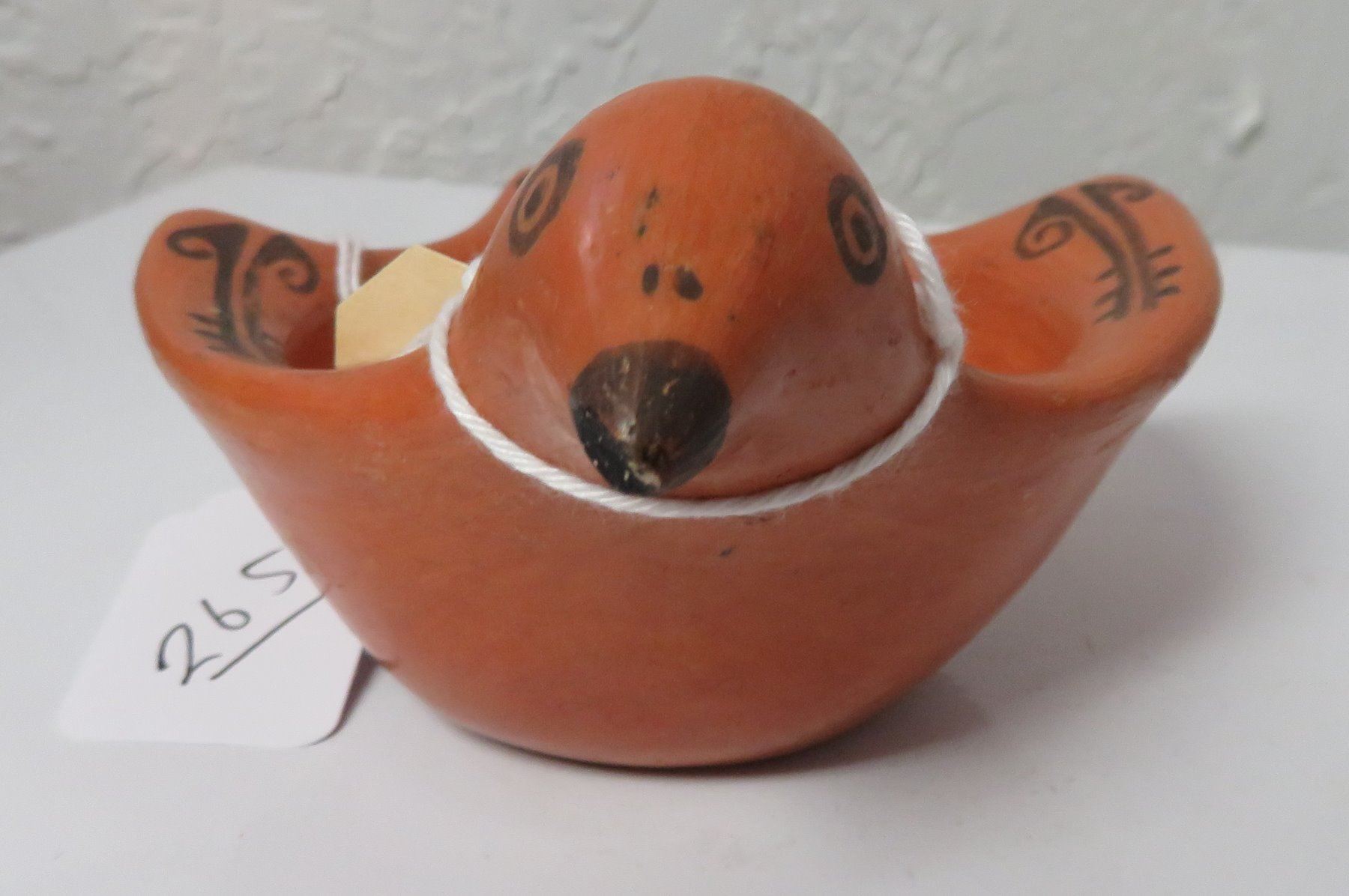 Santa Clara Pottery Thunderbird, c. 1960s. Made of clay and paint, the item measures 6" x 4 3/8" x 2 3/4". Santa Clara Pueblo, New Mexico. Nice paint and form to this classic, Santa Clara thunderbird. Condition: Good, see images. Shipping: $17.50 w/insurance and signature, double-boxed.