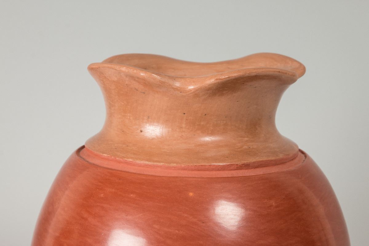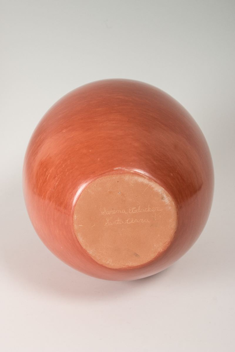 Santa Clara Pueblo Jar by Sarena Ebelacker (1985 - ). 12” x 8”red jar, signed on bottom: Sarena Ebelacker, Santa Clara. Provenance: Includes 2nd place ribbon from the 81st Annual Santa Fe Indian Market. Sarena is the great granddaughter of Margaret Tafoya. Ex. Rutt Bridges Collection.