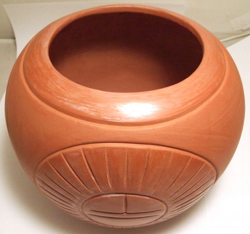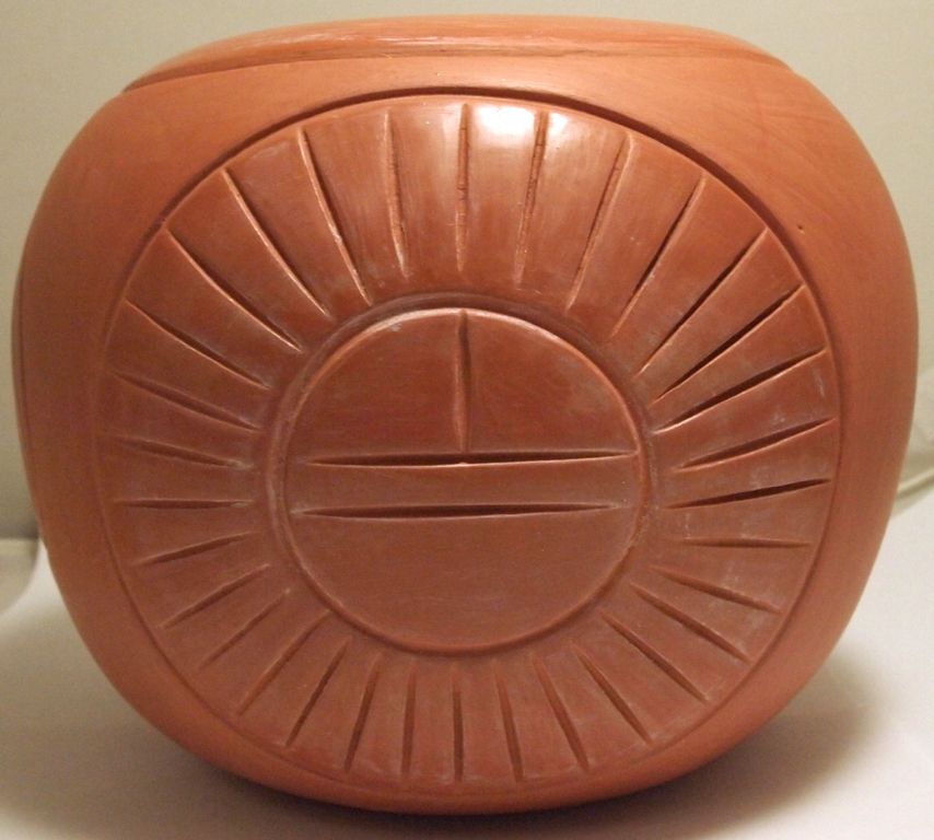 Santa Clara Pueblo Large Sun Face, Rainbow & Corn Design Etched Pottery - Miana Pablito