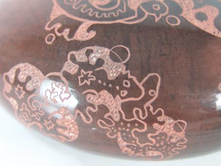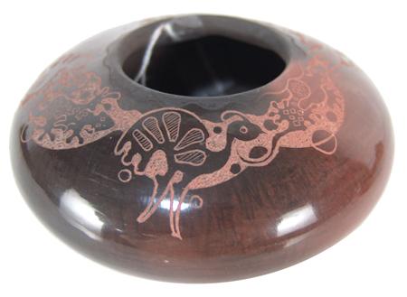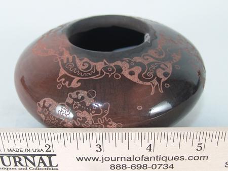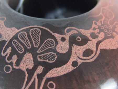 Exquisite sgraffitto earth brown seed jar with high polish and anthropomorphic animals encircling rim. 2" x 5-1/4"