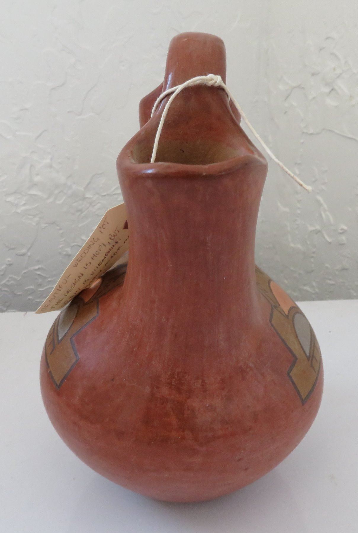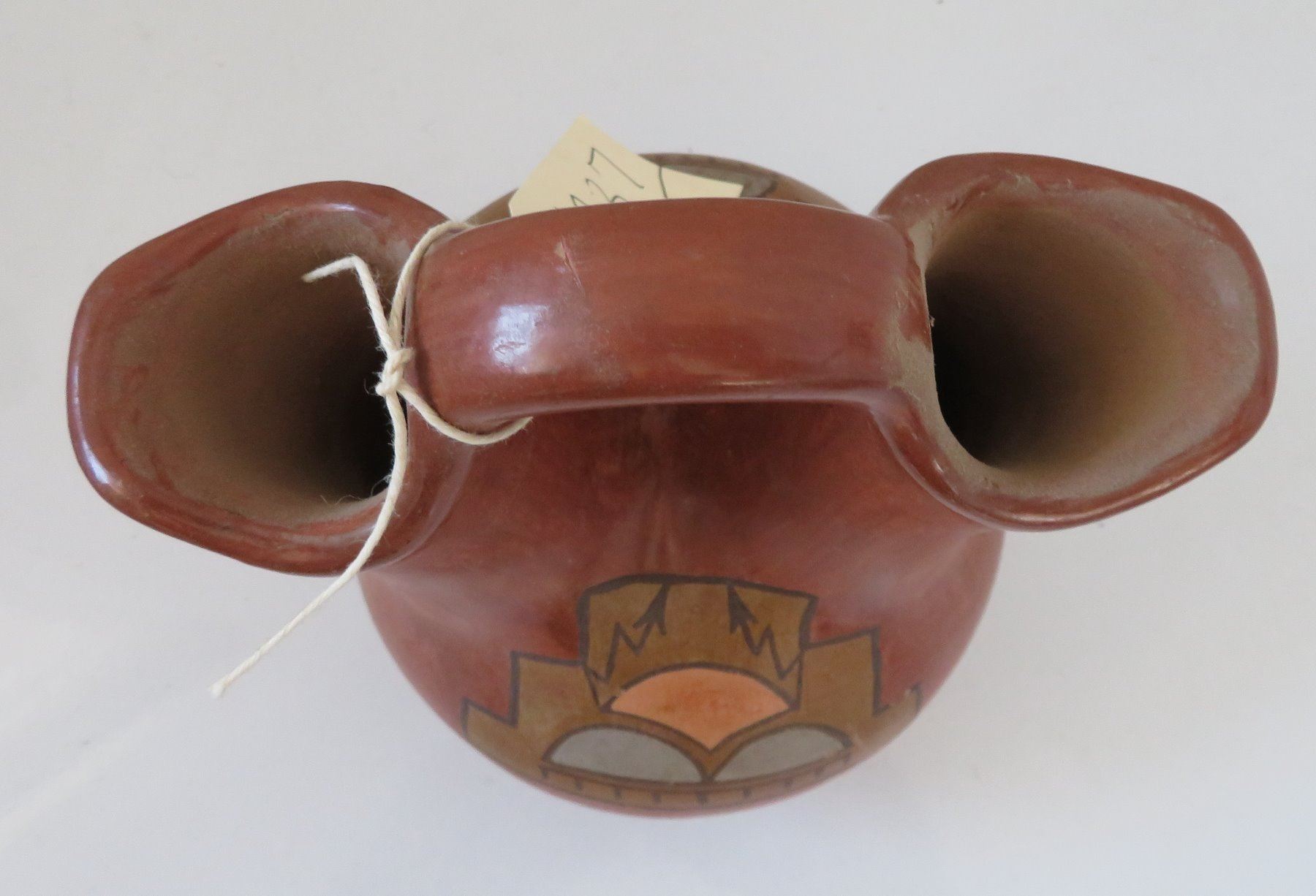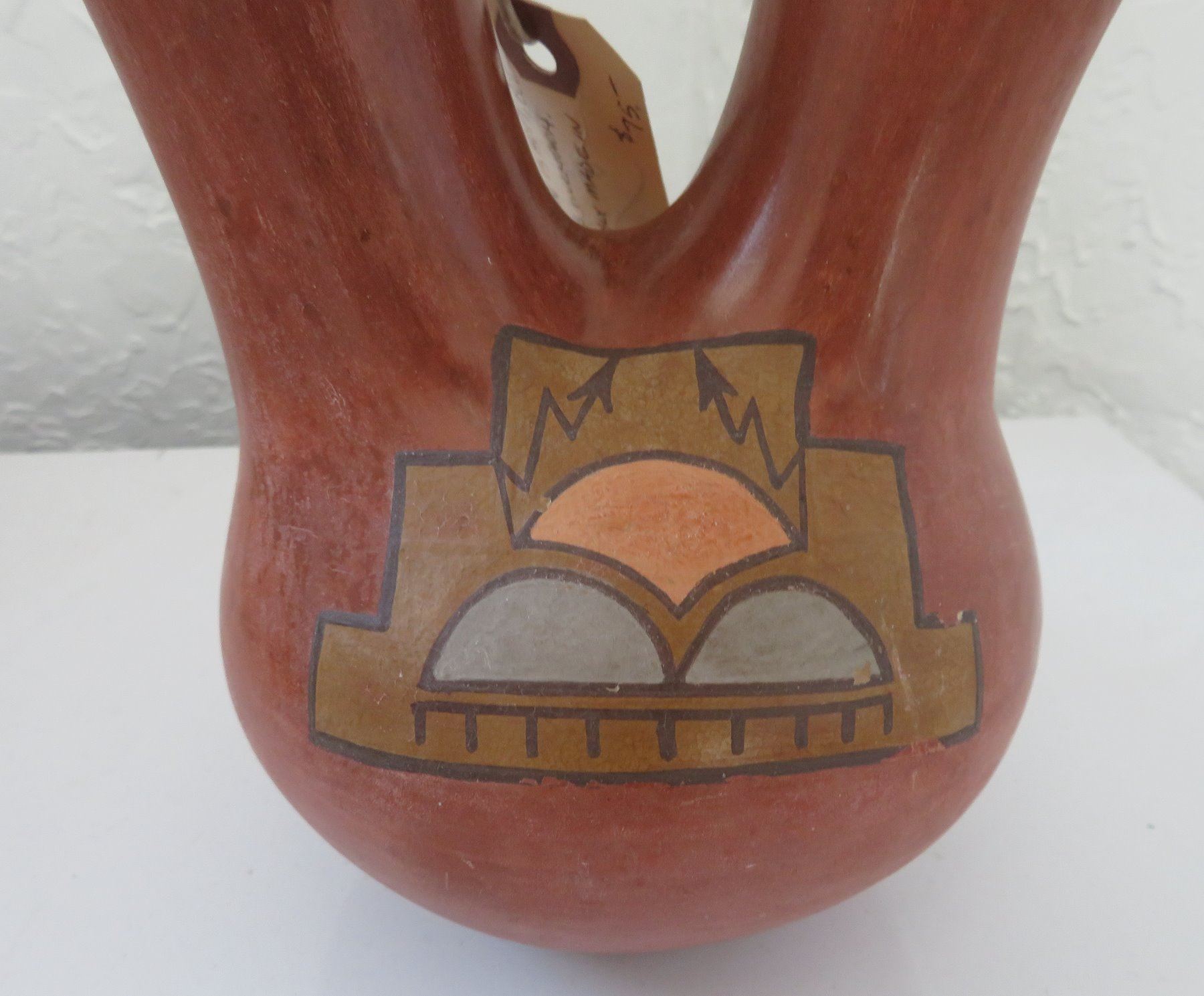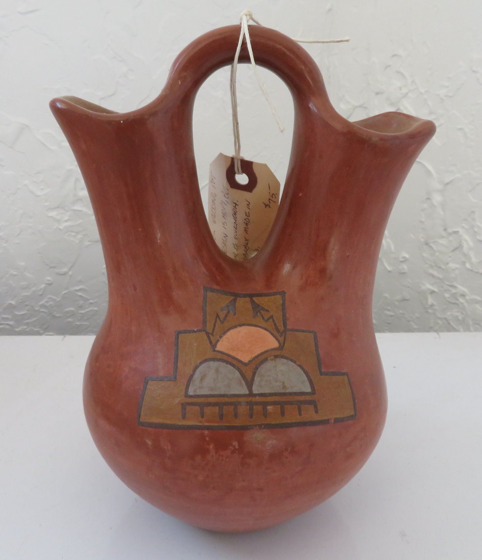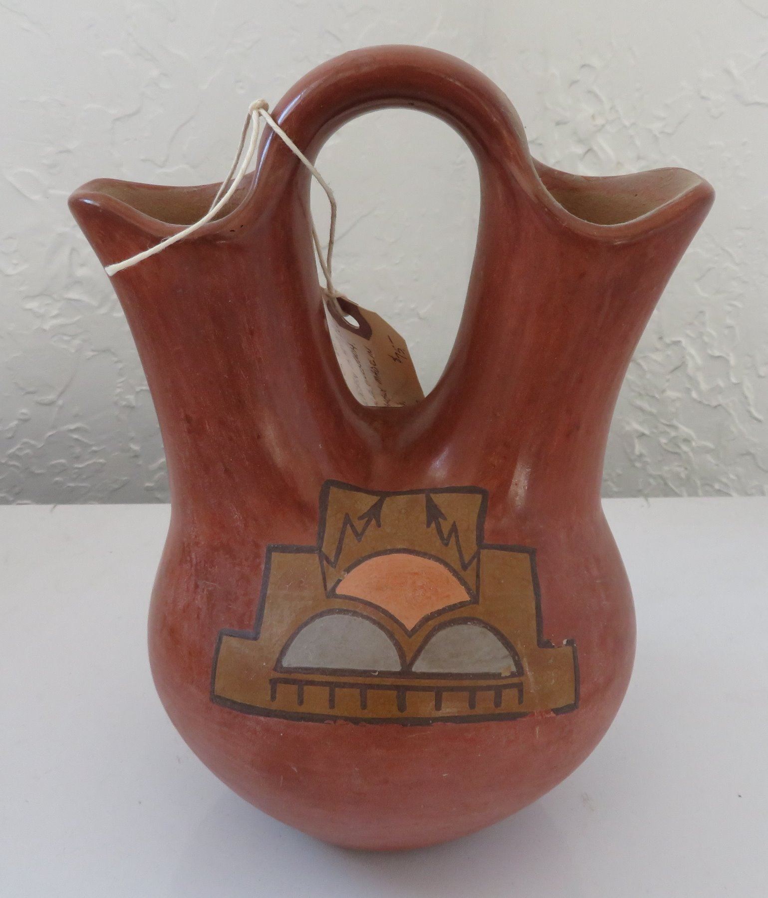 Santa Clara Wedding Pot, c. 1940s. Made of clay and paint, the item measures 8 1/2" x 6". New Mexico. Rain cloud picture on pot. Condition: Some wear, see images. Shipping: $34.00 w/insurance and signature, double-boxed, due to weight.